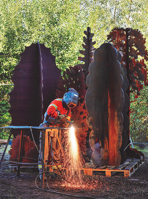 Geile’s sculptures are handmade from Corten steel; a weatherproof steel that forms a protective layer which stops further corrosion. They therefore have an unlimited life span and do not stain. The patterns are first drawn onto sheet metal then hand cut, assembled like a 3D puzzle and finally welded together.
