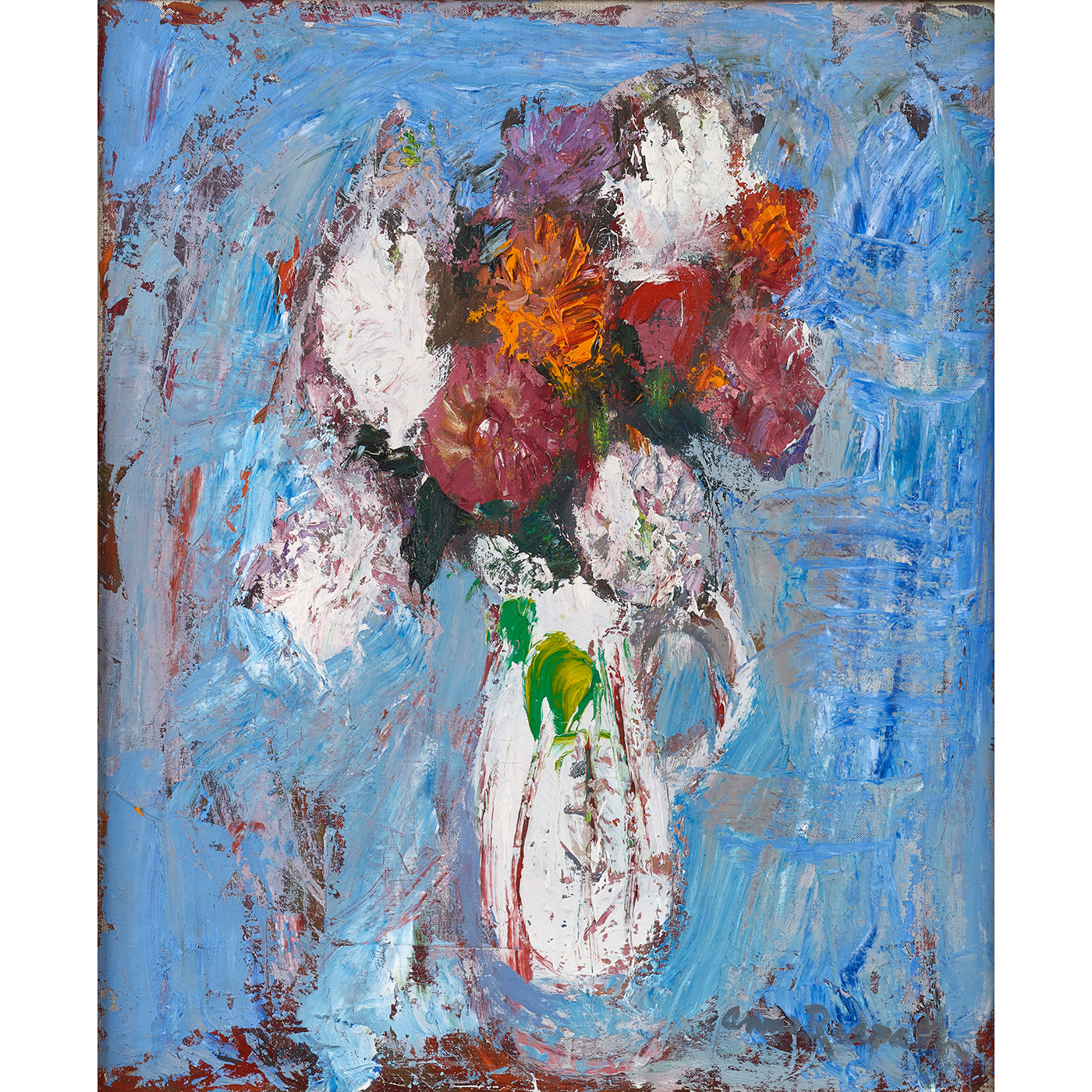 Dark Tulips in a Jug is a masterful example of Anne Redpath’s late work: bold, expressive, and rich with texture. Painted in 1962, during the final phase of her career, it reflects her confident approach to still life and her move away from conventional spatial order towards rhythmic abstraction.