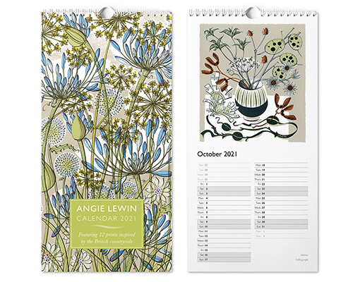 We have a lovely selection of products that feature the work of Angie Lewin. For 2021 Angie Lewin has produced a wire bound hanging calendar that features a selection of her screenprints, linocuts, wood engravings and lithographs. We also have Limited Edition Invitations to her latest exhibition, Nature Assembled, which folds out to a full page image of Lustreware and Ivy, Glenarder, The proceeds of which go to Maggie’s, the home for cancer care.