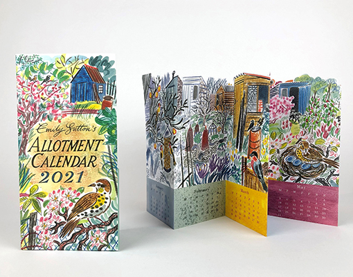 Emily Sutton designed a hugely successful desk calendar for Art Angels based on vintage tin toys which they produced for 2018 and 2019. They have commissioned this new design from Emily for 2021. This years design is the same format as before; a concertina form desk calendar which comes in a display wallet. The design echoes the die cut allotment cards that Emily has created before and reflects the change in the growing year of the allotment. The reverse of the calendar is simple block colours. We also have signed copies of her beautiful illustrated children’s books: Clara Button and The Wedding Day Surprise, One Christmas Wish and The Tale of the Castle Mice.