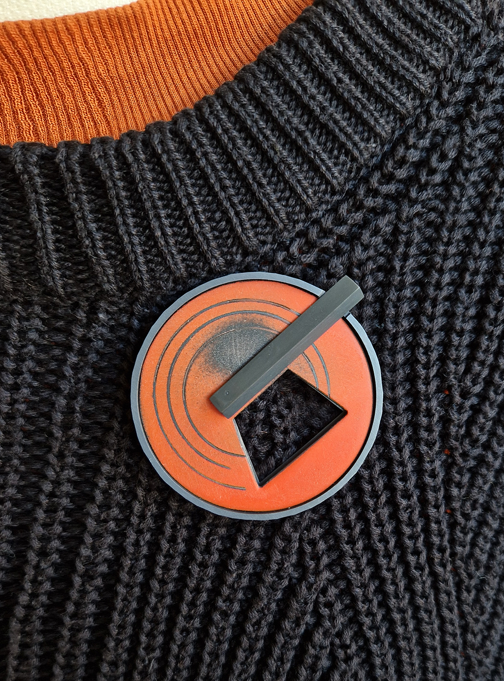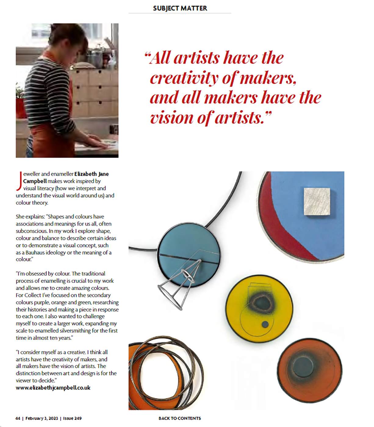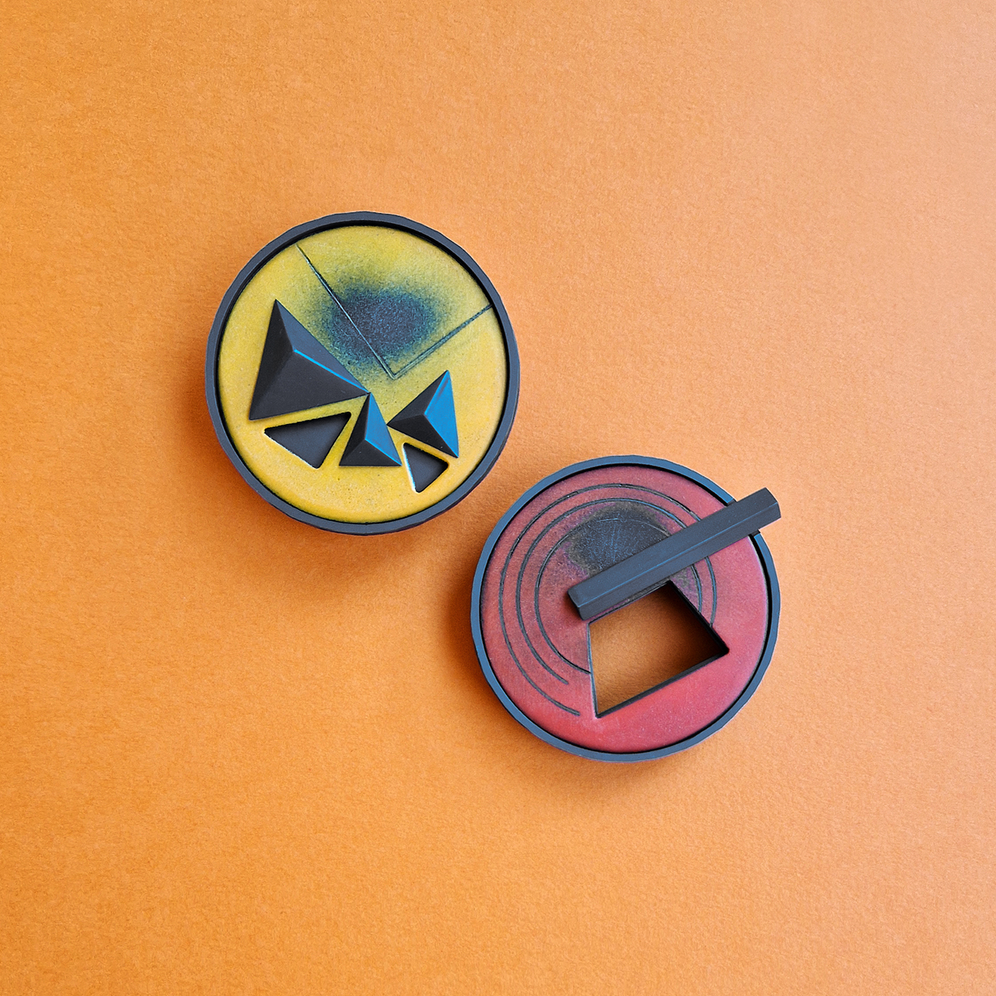 Elizabeth Jane CampbellFor Collect 2023 with Craft Scotland I have made a series of works inspired by the secondary colours – purple, green, and orange. The pair of brooches are inspired by the colour orange. I took inspiration from the Kandinsky print ‘Orange, 1923’ which informed the shapes and compositions of the brooches, while the choice of colour came from one of my favourite Kandinsky quotes: “orange is red brought nearer to humanity by yellow.” One brooch is a red-orange, and the other is a yellow-orange - so together they balance each other. Both brooches have a ‘true’ orange shade of enamel on the reverse – a flash of this colour can only be seen by the wearer and is quite literally bringing the colours nearer to humanity when the brooches are worn.