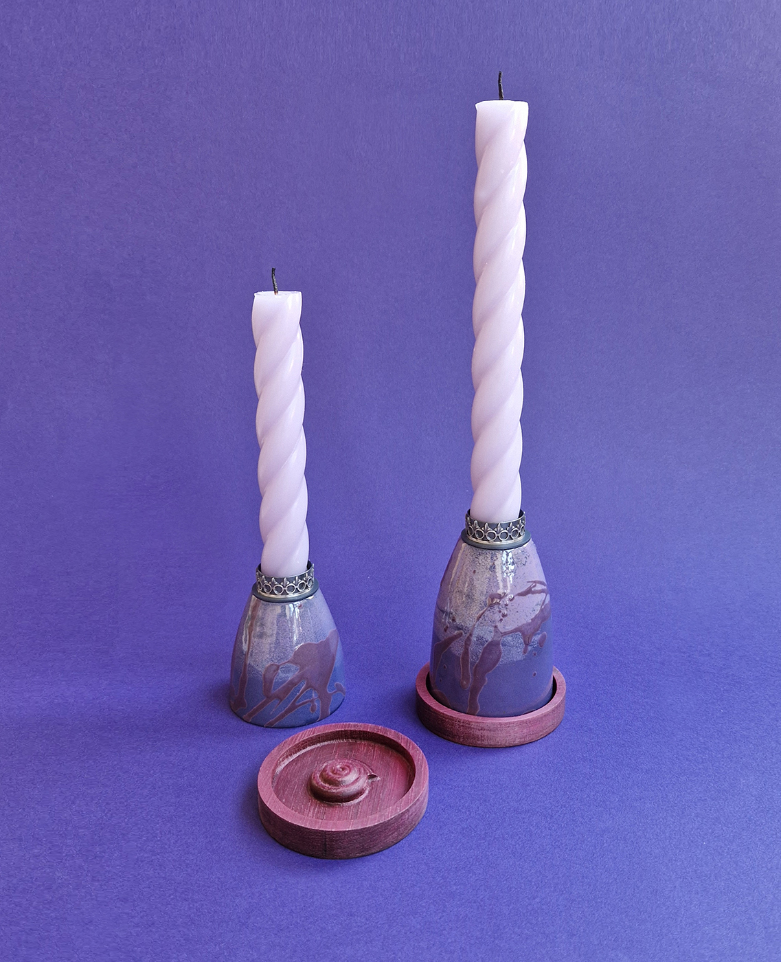 Elizabeth Jane CampbellThe candlestick holders are inspired by the colour purple. Historically, purple is a royal colour, which is why the candlestick holders are in the form of a King and Queen. The silver element not only holds the candles in place, but also acts as their tiny crowns. Purple also has a more gruesome side to its past, as a particular shade of purple pigment was made by collecting and processing thousands of sea snails - this brutal end to the sea snails lives created a stunning shade of purple and inspired my use of enamel. Another tribute to the snails' role in purple's history is found on the purpleheart wooden base - when you lift the enamelled section a wee carved snail is revealed hiding underneath.