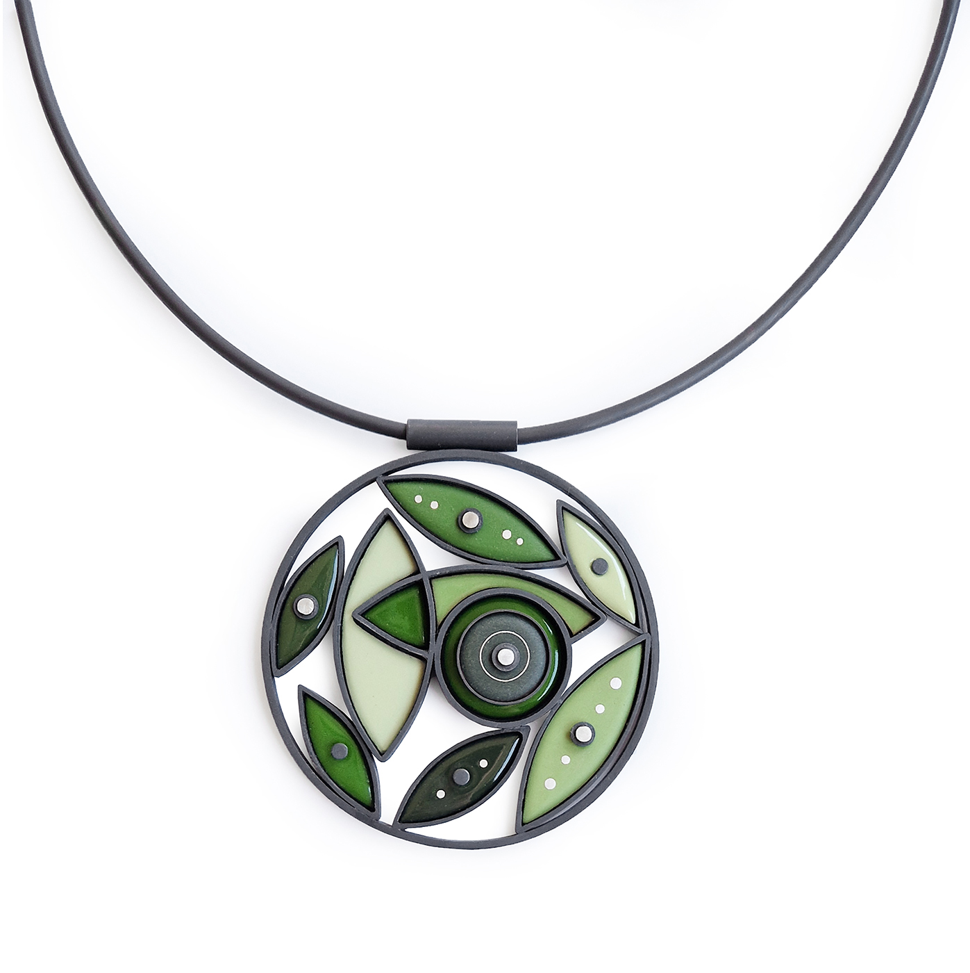 Elizabeth Jane CampbellThe necklace is inspired by the colour green - green is one of the most abundant colours in the world and often associated with nature. The shapes within the necklace could be seen as leaves, but if you look closer there is an eye at the centre of the composition which is a reference to the 'green eyed monster' - a phrase first used in Shakespeare's Othello to describe jealousy...