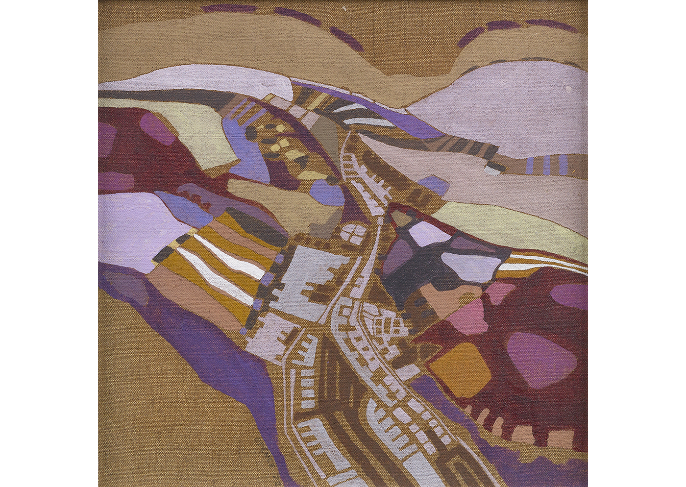 James Spence was the son of Highland fisherfolk from Findhorn who travelled south to Glasgow, much of James Spence’s subject matter could be traced to his childhood experiences – an evening at an open air boxing match in Glasgow, for example, the fighter silhouetted in brilliant light, a mass of crimson blood covering the face of one man. He was also inspired by the landscape of the north-west Highlands. This work, Galashiels from 1972, is part of a series inspired by the aerial patterns of the Borders landscape. A sister work is in the collection of the Hunterian in Glasgow.