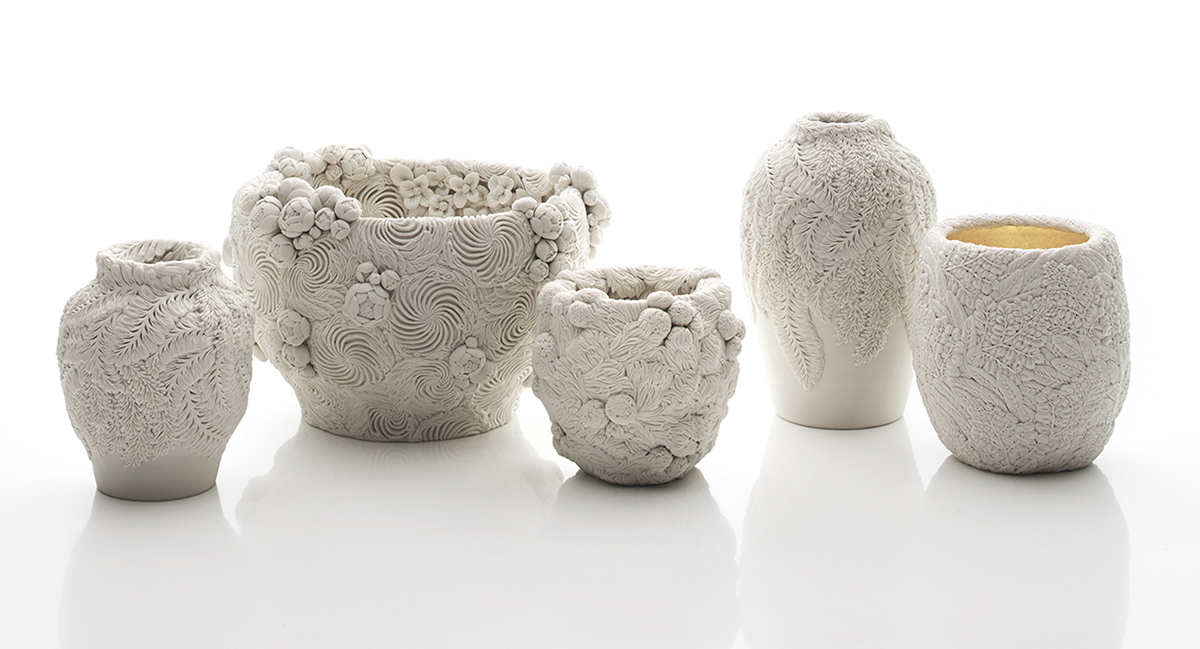 Hitomi Hosono’s detailed porcelain vessels reference the natural world and botanical specimens. With a chalk-like finish and gold embellishments, the work captivates with its delicacy and has attracted the patronage of museums worldwide including the British Museum, Victoria & Albert Museum, London and National Museums Scotland, Edinburgh.