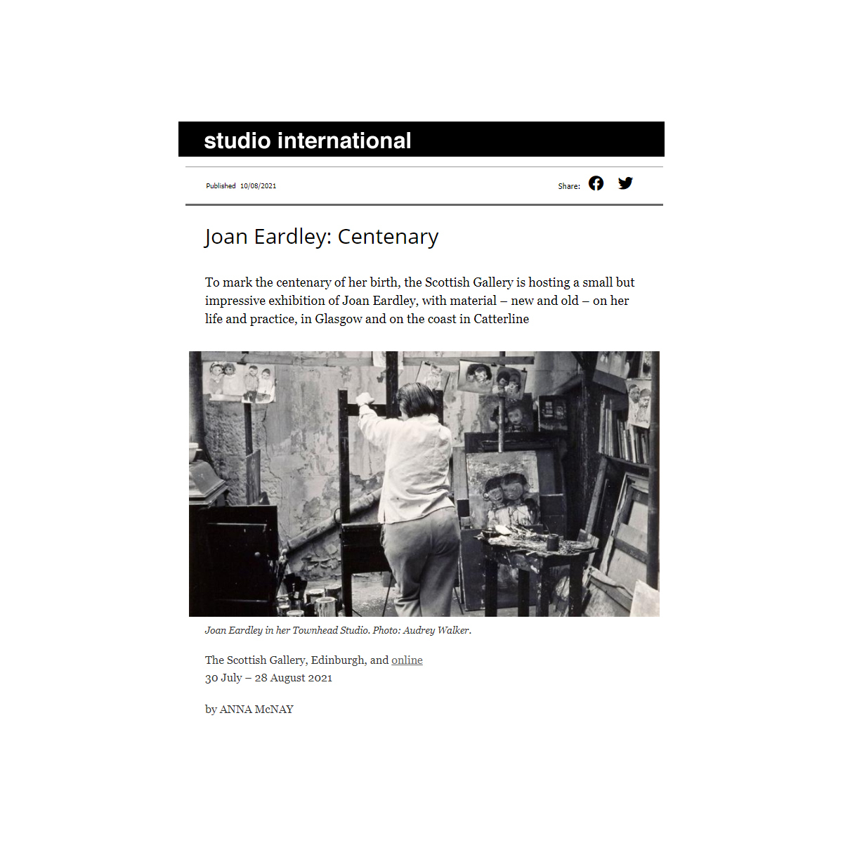 Across Glasgow and further afield in Scotland, events will be unfolding throughout this year and next in Eardley’s honour... in Edinburgh, the Scottish Gallery, which had a close relationship with the artist in the 1950s, is planning a centenary show to coincide with the Edinburgh International Festival; its director, Guy Peploe, echoes the sentiments of Lachlan Goudie in lamenting that it has taken ‘such a long time for her reputation to move out from Scotland’, and hoping that events here will lead to a wider reappraisal.