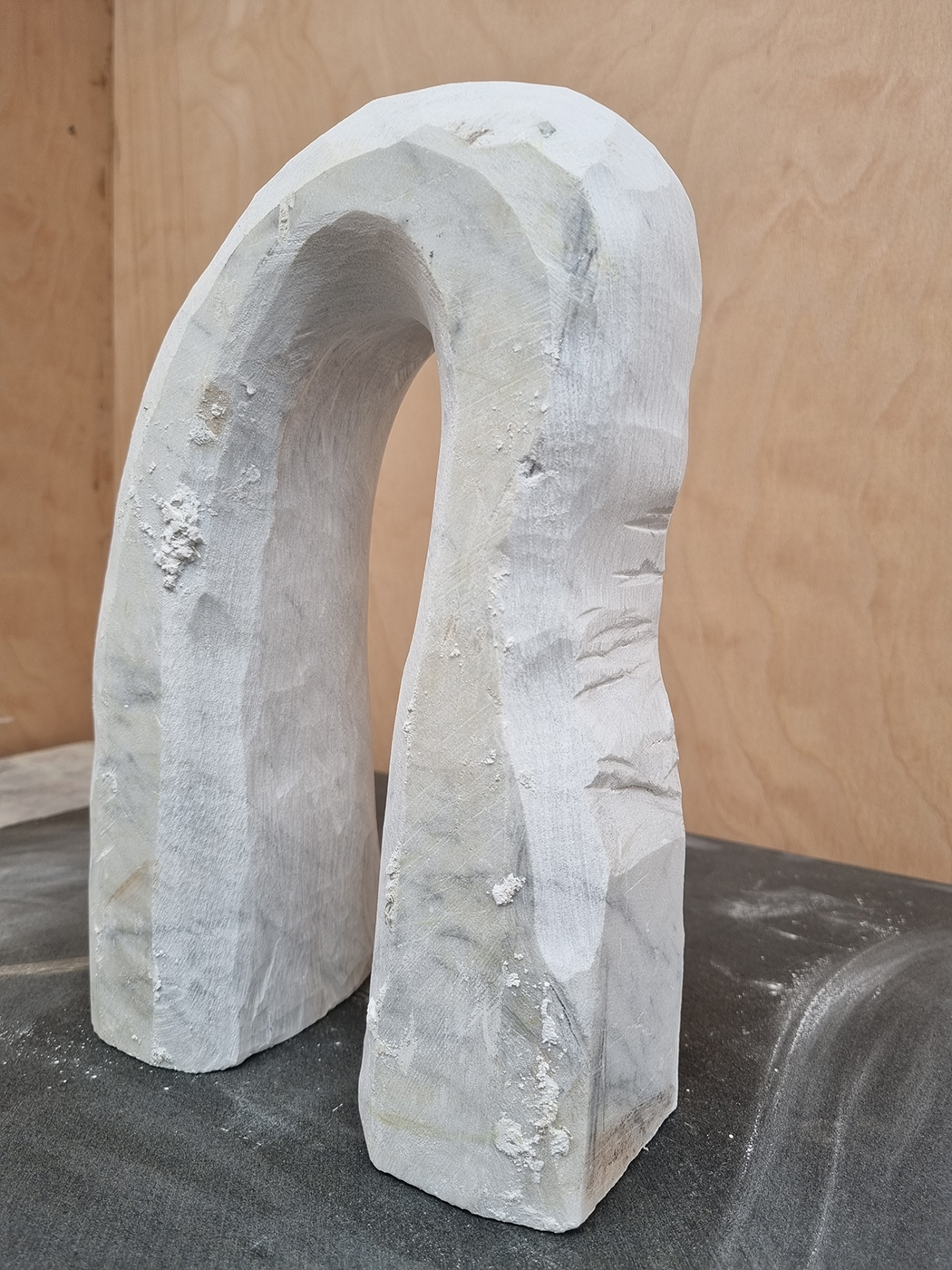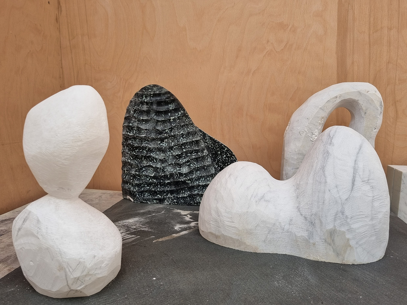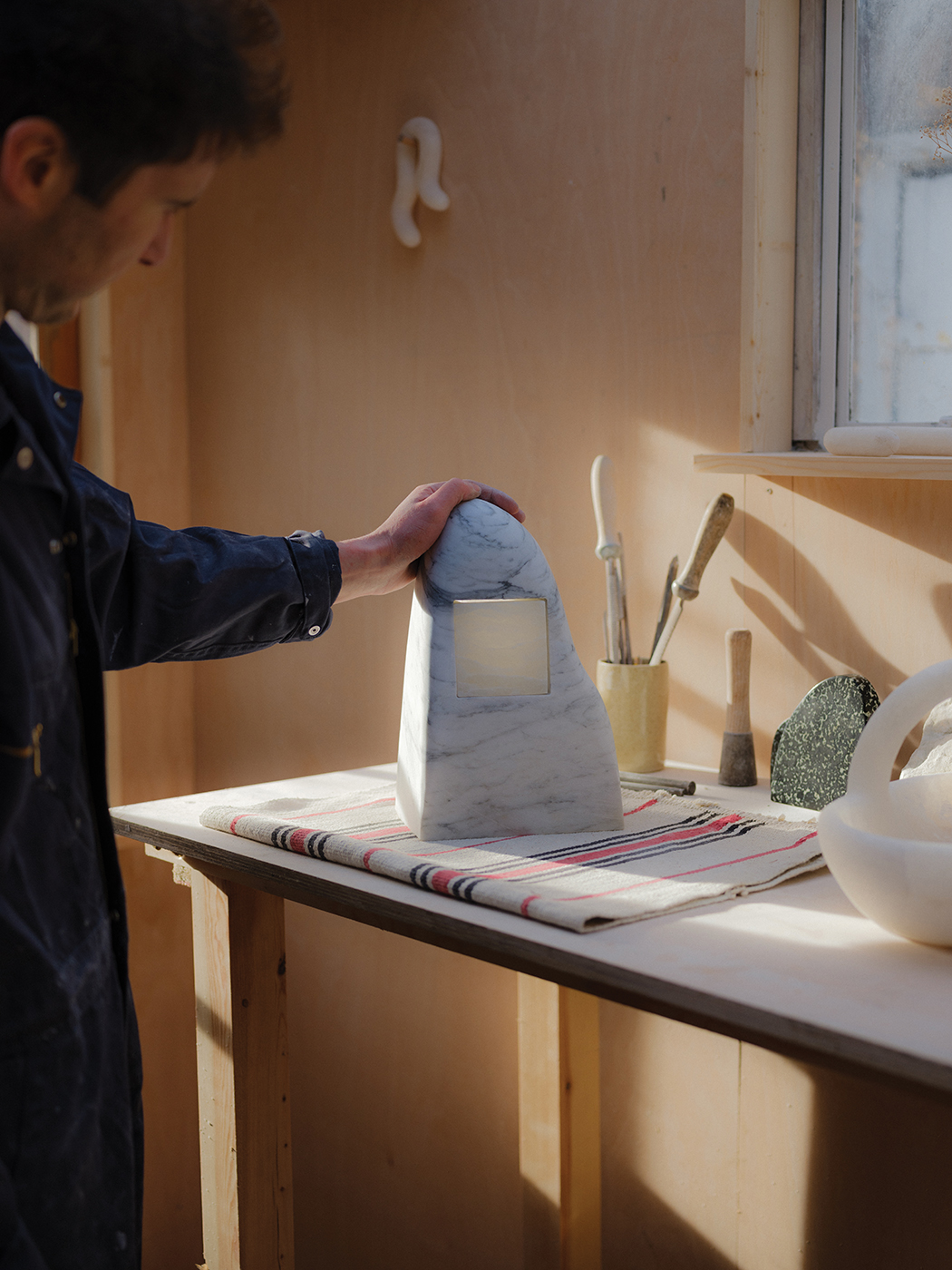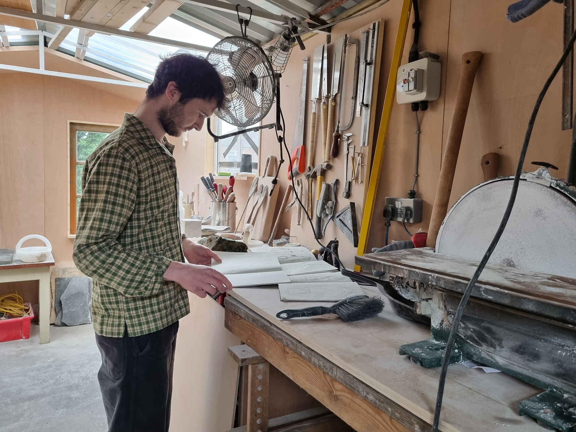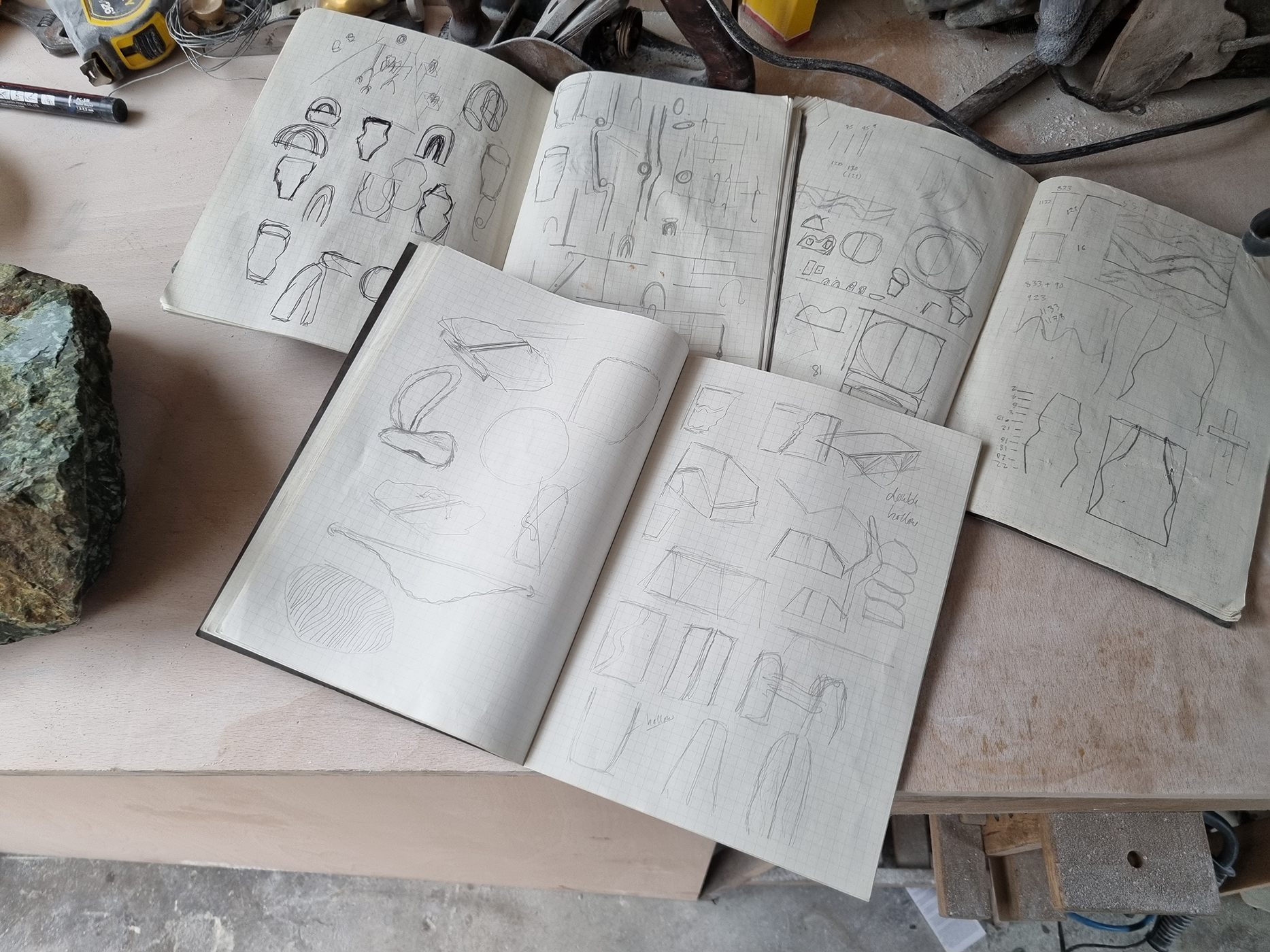 I keep notebooks everywhere to work out different shapes. Once I’ve got an idea of what I want to make, I’ll mark it out on a block of stone, and then cut it down using an angle grinder. When I’ve got the rough form, I’ll shape it using a combination of hammers, chisels, rasps, files, sandpaper and wet polishers.