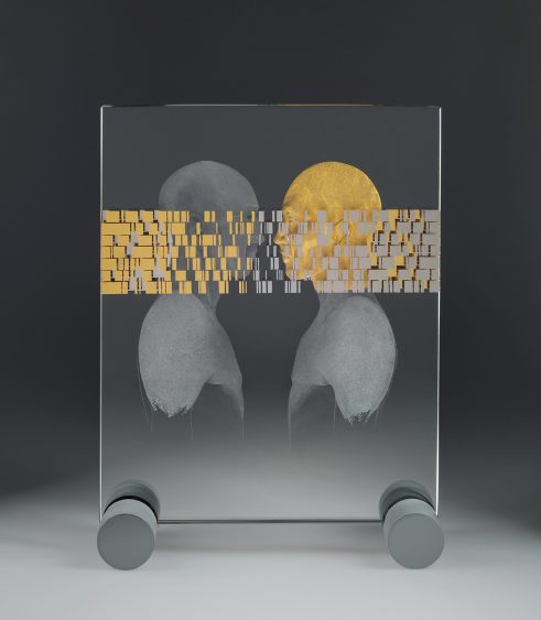 glass panel; diamond wheel and stone engraving; 24ct gold and palladium leaf; wooden feet (freestanding)