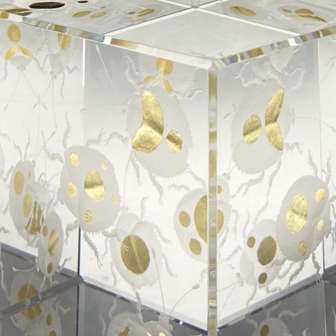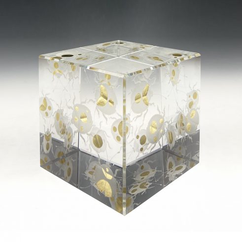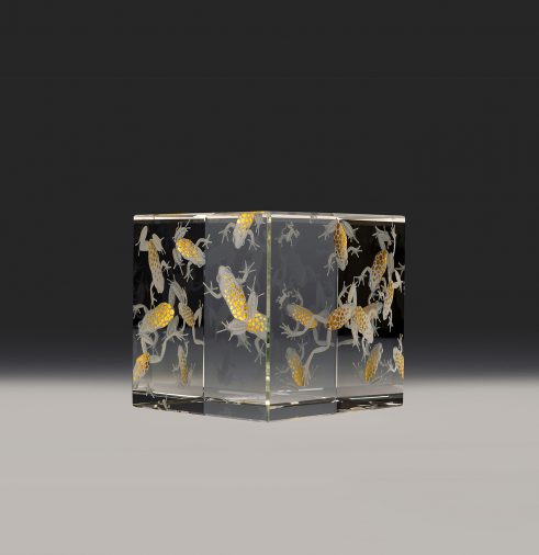 optical crystal block; diamond wheel and stone engraving; 24ct gold leaf; wooden plinth