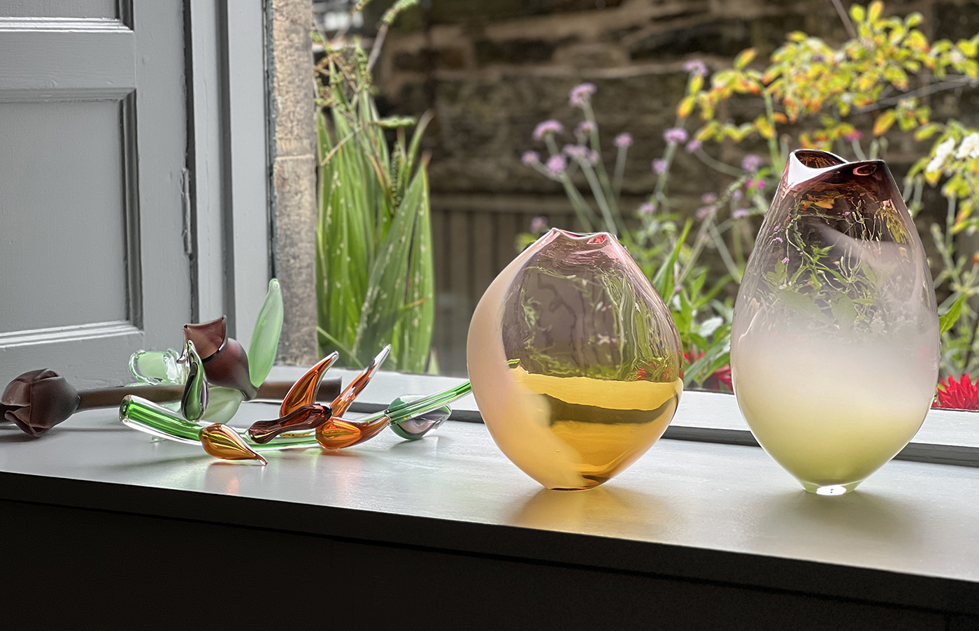 Born in Canada, Michèle Oberdieck has been working with blown glass since her MA at the Royal College of Art in 2016. She previously studied textile design at Glasgow School of Art and ran a successful printed textile practice for several years. This shift of material was the result of a significant commission involving the development of a new technique of fusing printed fabrics between sheets of glass. A moment that sparked curiosity in this new medium, paving the way for a new creative direction. Oberdieck has exhibited internationally and her work was selected for the European Prize for Applied Art Exhibition 2022 in Belgium, as well as the Ireland Glass Biennale 2019, being one of just 50 international artists on show. Most recently, Oberdieck was awarded the QEST (Queen Elizabeth Scholarship Trust) grant in 2023, allowing continued training in blown and sculpted glass.