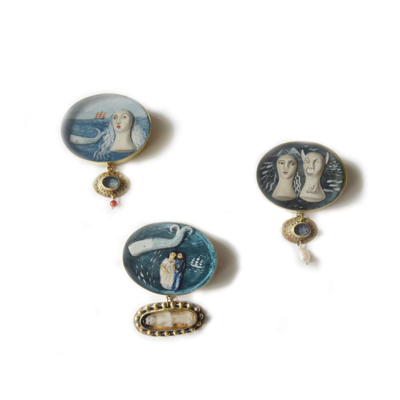 Rachel Larkins is a designer maker whose practice has focussed on creating jewellery with a strong sense of narrative and a nod to the tradition of miniatures. Larkins works primarily in resin, brass and wood, often encapsulating imaginary scenes and figures which are hand modelled and painted. Based in the village of Sopley, Larkins’s influences range from the surrounding rural landscape and seasonal folklore to magical realism in literature and painting.