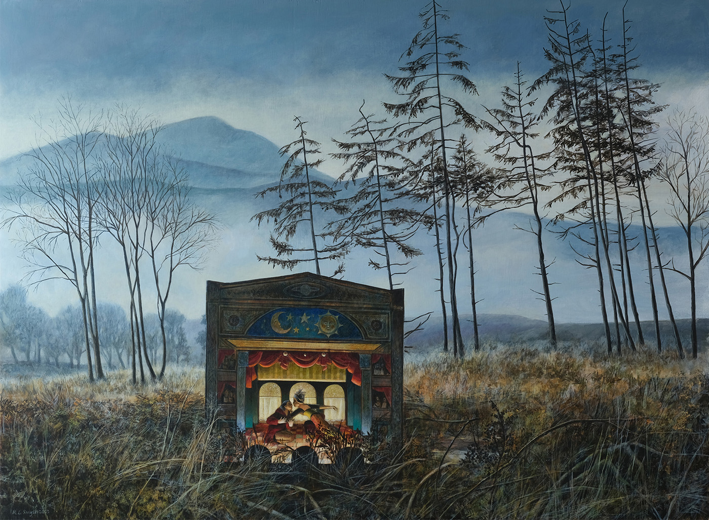 I hope that my paintings elicit curiosity, allowing the viewer to fill them with their own narratives, with their own memories real or imagined, like fairy tales. My aim is to try to evoke that moment of anticipation in a theatre, when the curtain lifts on the stage and reality is suspended.