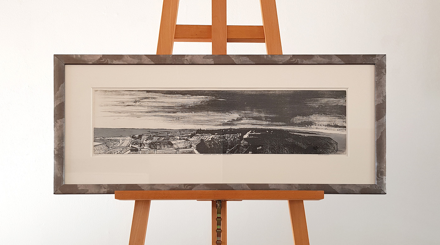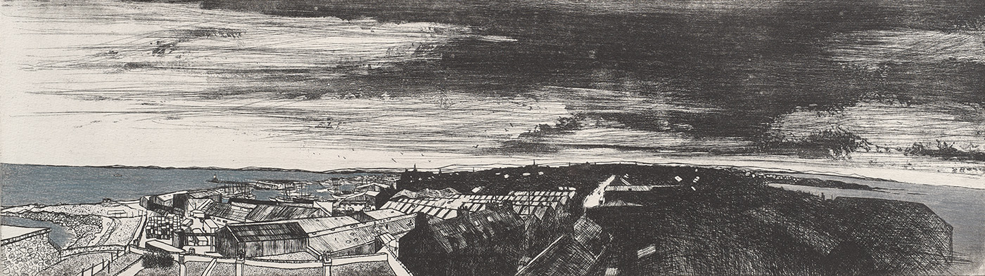 In Approaching Squall over Fraserburgh, Frances Walker conjures a brooding, elemental vision of the northeast Scottish coast, captured in her hallmark medium of etching. The work is both monochromatic and restrained, with one bold gesture of colour, the sea rendered in a deep, expressive blue, punctuating the otherwise tonal drama of the landscape. The elongated format heightens the sweep of space and sky, as a looming squall presses in from above, shifting light and wind in its wake. Fraserburgh lies in its path, exposed, coastal, and enduring. Technically, Walker’s mastery of etching allows her to layer texture, line, and tone with extraordinary sensitivity. In this etching, delicate hatching builds the clouds’ weight, while the etched lines of the shore hold a quiet, tensile energy.