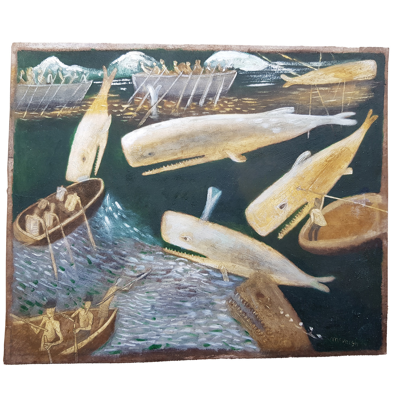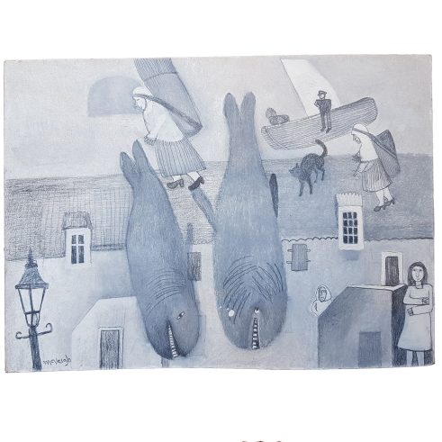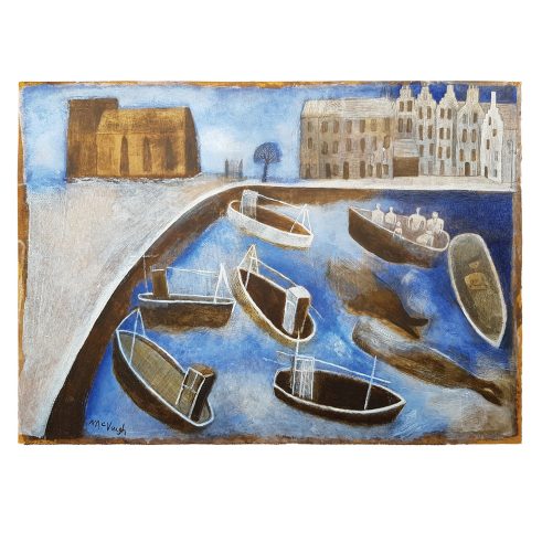 Michael McVeigh is a modern day folk artist who depicts the world around him. He is a participant observer who has created a naïve and sophisticated setting for contemporary life and history. There is something of the medieval chronicler about him; he draws and paints what is there, and what is worth depicting because it is an essential, occasionally quirky, part of human existence.
