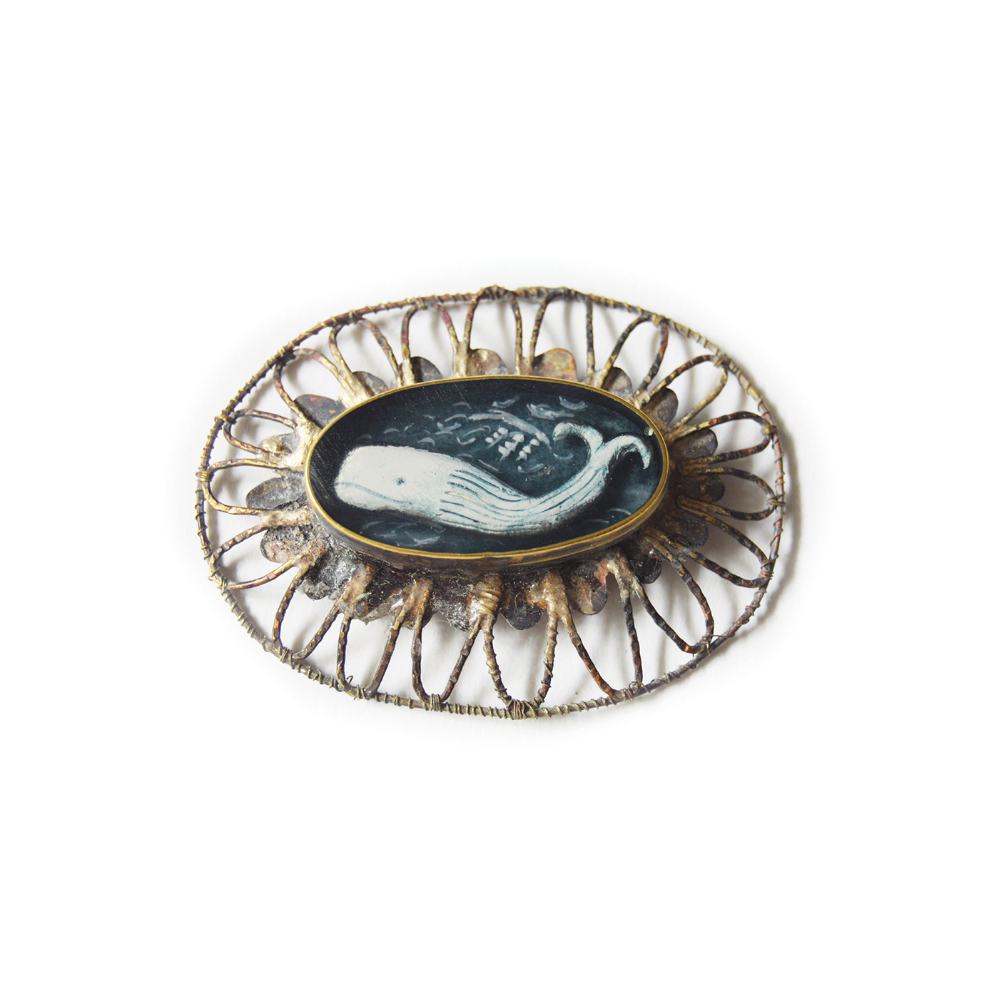Rachel Larkins is a designer maker whose practice has focussed on creating jewellery with a strong sense of narrative and a nod to the tradition of miniatures. Larkins works primarily in resin, brass and wood, often encapsulating imaginary scenes and figures which are hand modelled and painted. Based in the village of Sopley, Larkins’s influences range from the surrounding rural landscape and seasonal folklore to magical realism in literature and painting.