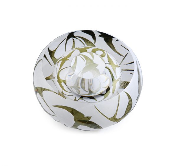 Katharine Coleman studied engraving techniques with Peter Dreiser 1984-6 and was shortlisted for the Jerwood Applied Arts Prize 2003 (Glass), awarded an Honorary Mention Prize at the Coburg Glass Prize 2006 and the Glass Sellers inaugural prize for Engraving on Glass 2007. In 2009 Katharine was awarded an MBE for services to glass engraving. She engraves on clear lead crystal forms, overlaid with coloured glass, blown to her design. Once blown and annealed, the top surface of the glass is cut and polished to allow one to see inside the piece, which is then engraved. The engraved decoration reflects and refracts onto the inner surface, creating an illusion of one body floating inside another. The inspiration for her work ranges from natural history to the modern urban landscape.