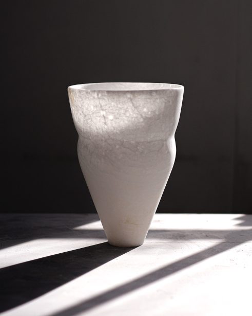 His methods draw on traditional carving methods and skills learned in ceramics and woodwork. Cook’s work is a quiet dialogue between material and luminosity, inviting viewers to engage with the subtle, shifting qualities of alabaster as light subtly diffuses within the stone.
