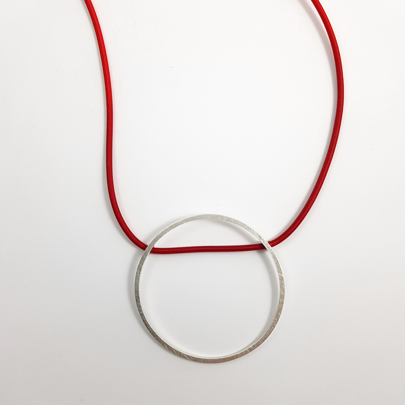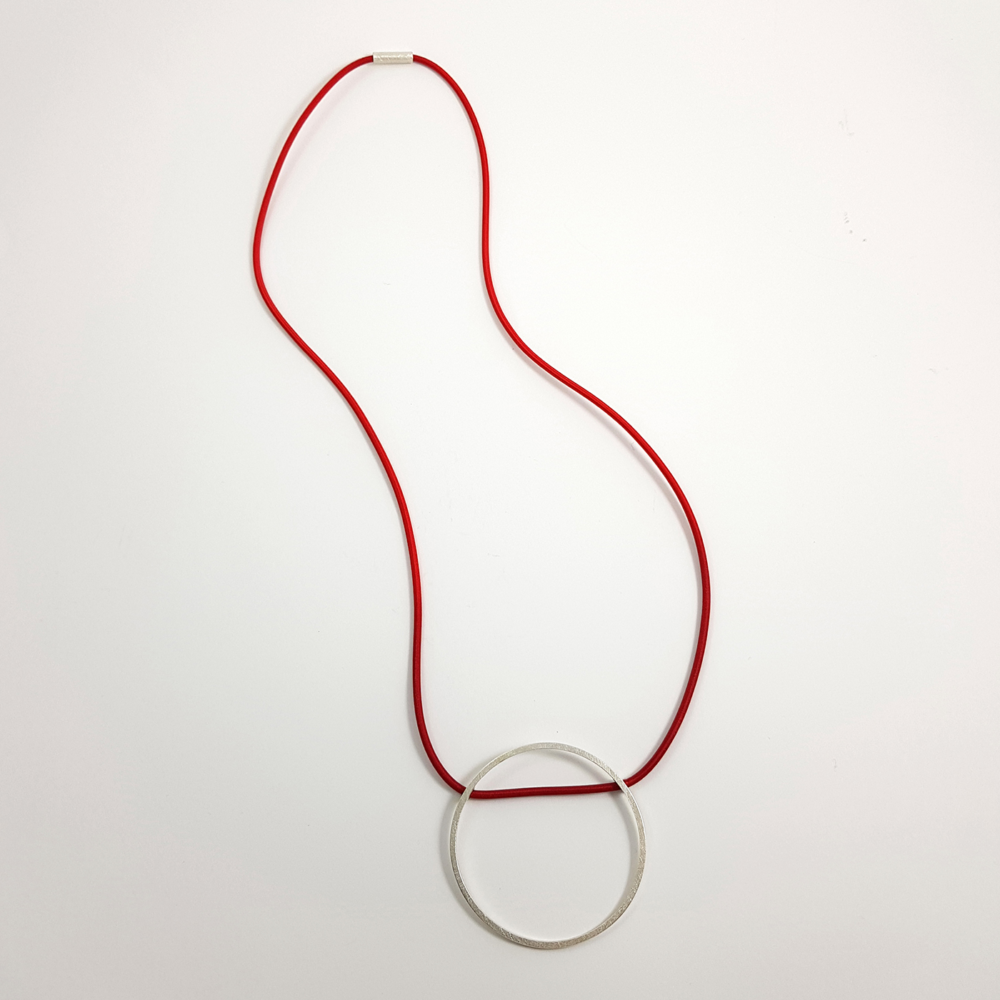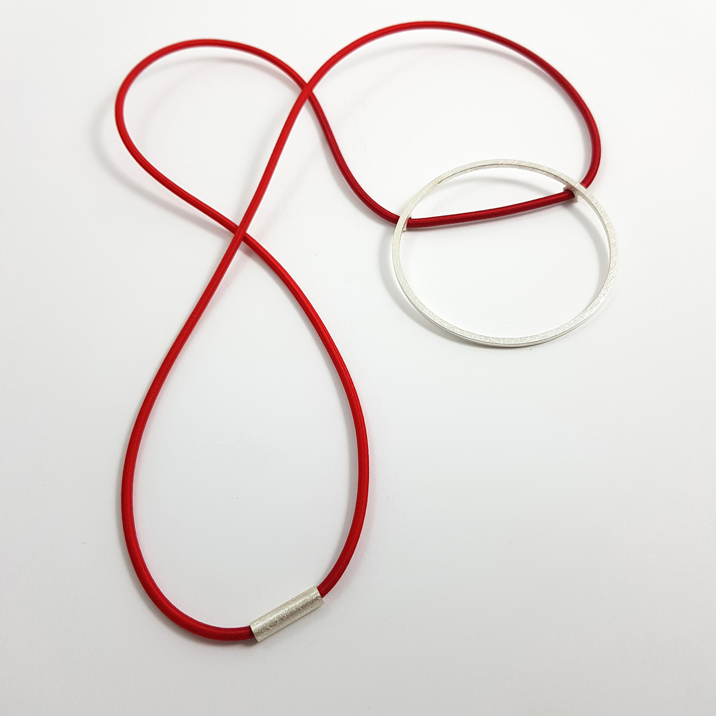 Gilly’s work is characterised by her use of architecturally inspired silver combined with vivid colours of hand-dyed elastic. Each piece is made by Gilly in small batches using recycled silver and limited dyeing processes, considering every aspect of sustainability in her workshop.