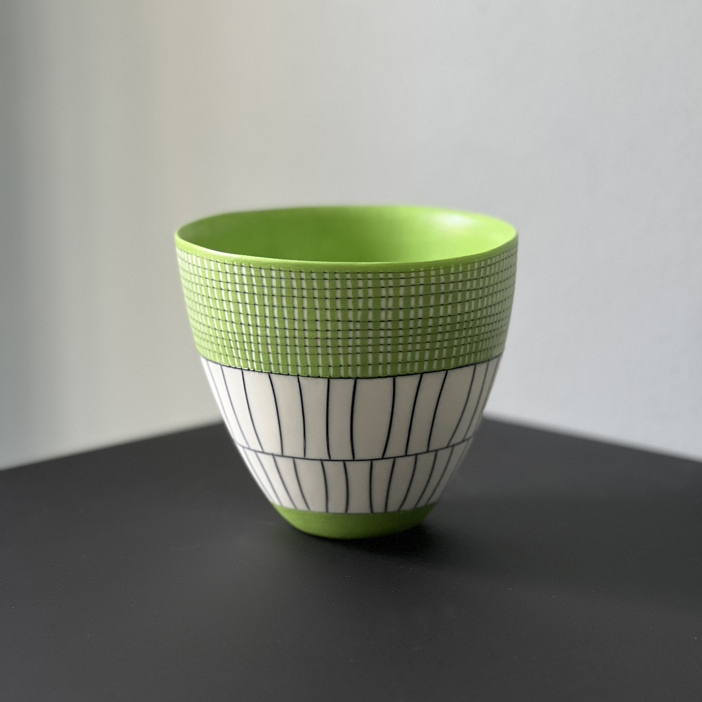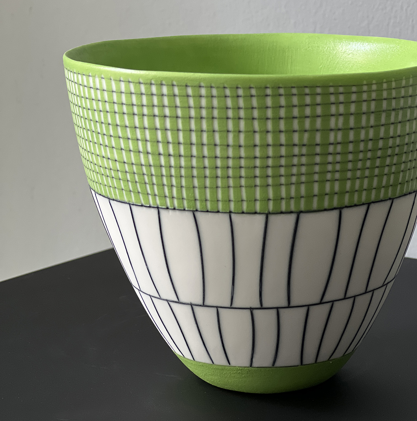 Lara studied ceramics at Camberwell College of Arts in London and has a Post Graduate from Edinburgh College of Art. Her current work is predominantly concerned with the dynamic interplay between form and pattern. This is explored through the cohesive integration of drawing, surface mark making and volume. She is equally interested in the space that surrounds pattern as much as the hue and texture of the decorated surface. This theme has been developed further within her ‘Tilted Bowls’ that articulate the symbiotic relationship between pattern and form. Surface pattern and colour observed in botanical life enable Lara to explore her love of colour and abstract pattern making.