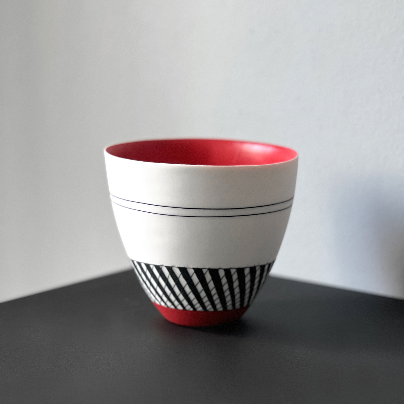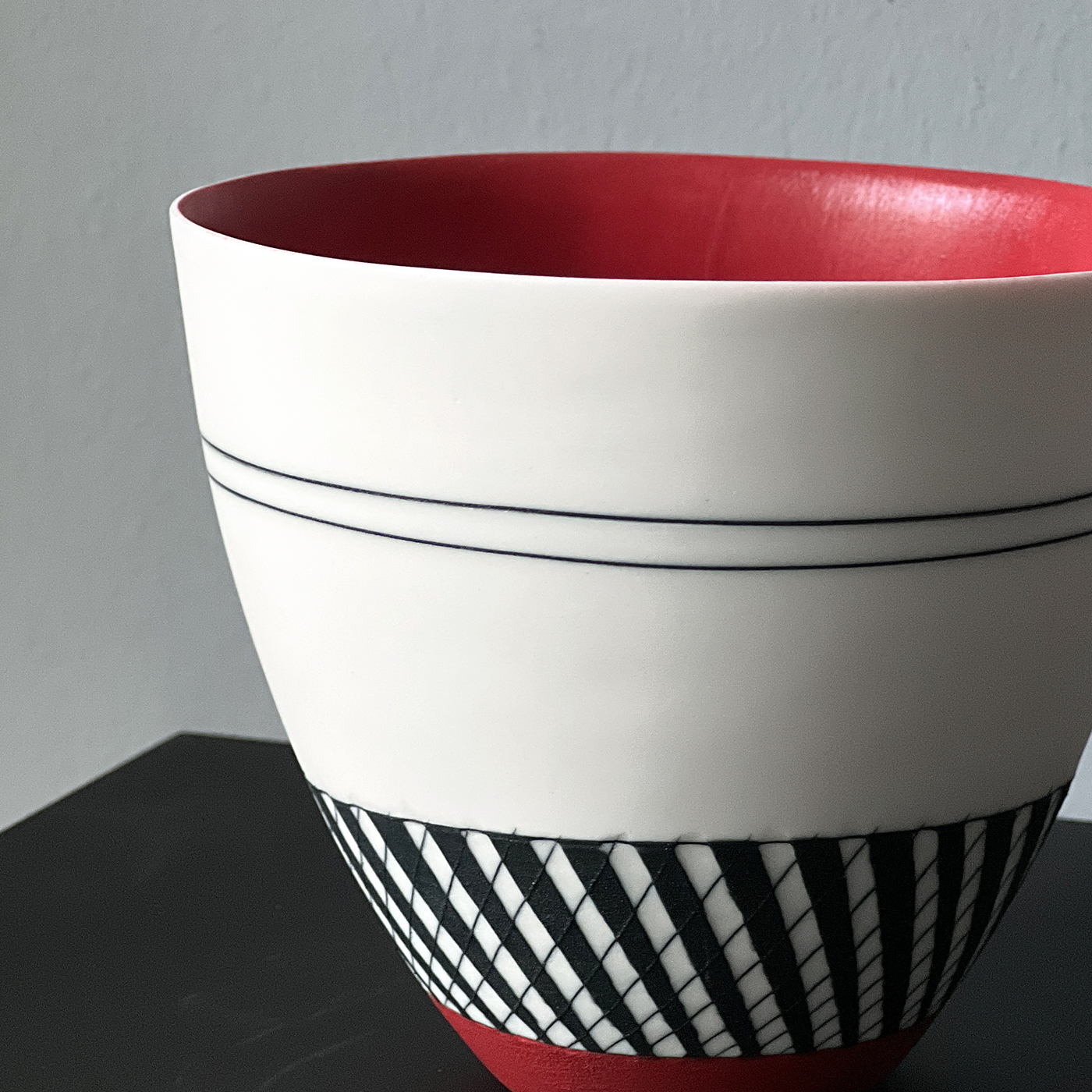 Lara studied ceramics at Camberwell College of Arts in London and has a Post Graduate from Edinburgh College of Art. Her current work is predominantly concerned with the dynamic interplay between form and pattern. This is explored through the cohesive integration of drawing, surface mark making and volume. She is equally interested in the space that surrounds pattern as much as the hue and texture of the decorated surface. This theme has been developed further within her ‘Tilted Bowls’ that articulate the symbiotic relationship between pattern and form. Surface pattern and colour observed in botanical life enable Lara to explore her love of colour and abstract pattern making.