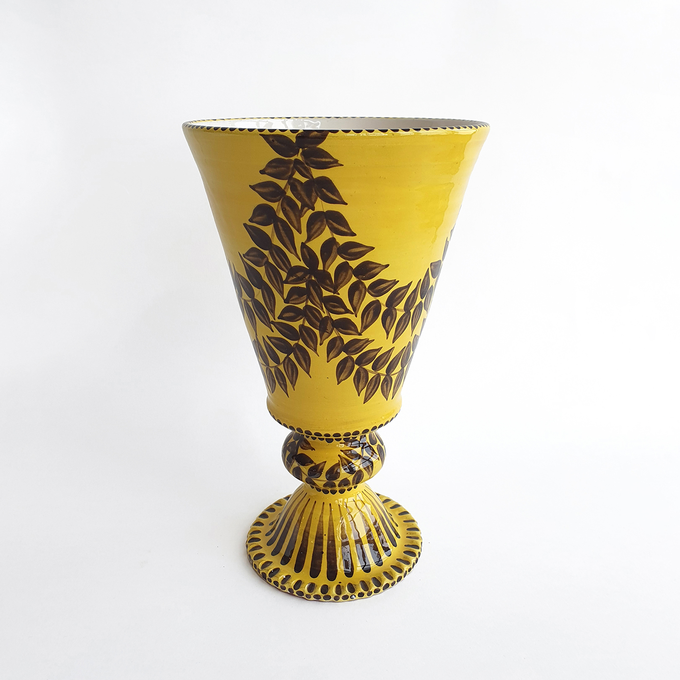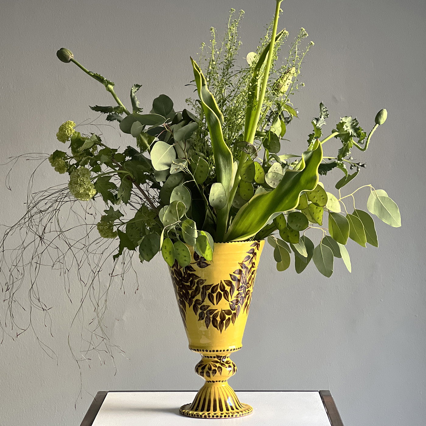 Katrin Moye spent her childhood in East Sussex with her brother, her German mother and British father, mostly drawing or reading. She studied English and Art History at Nottingham University, and spent 15 years working as a bookseller. Her obsession with clay began during an art foundation course at Hastings, Sussex in 1987. A further course in ceramics at Morley College, London a few years later made her decide to leave work and start her ceramics practice, which celebrated its 20th anniversary in 2024. She initially made small batches of hand painted, wheel-thrown tableware and refined her techniques and skills by trial and error, gradually moving away from the purely domestic/functional towards more elaborate, ornate pieces such as tulipieres, embellished vases and recreations of historical European ceramic vessels.