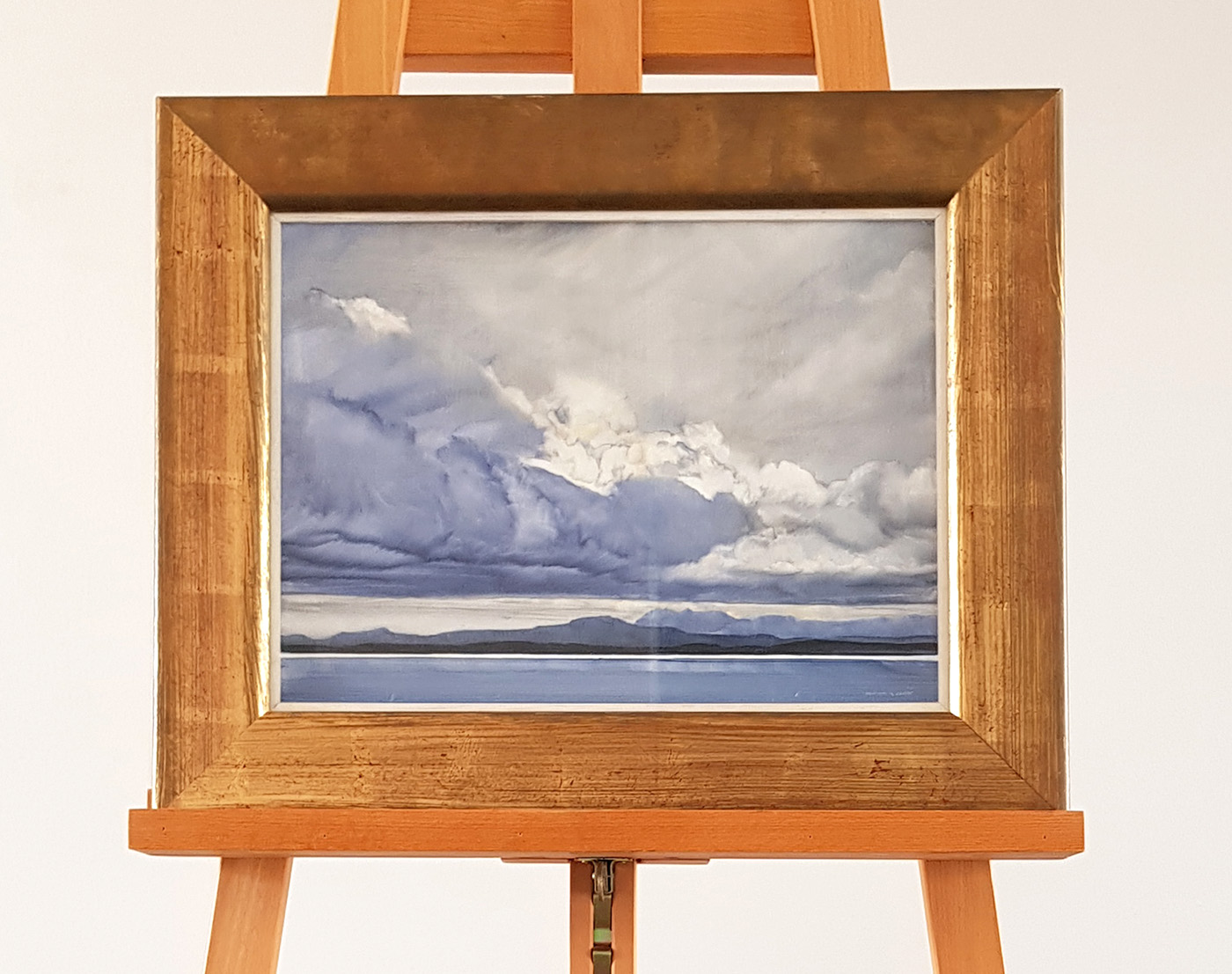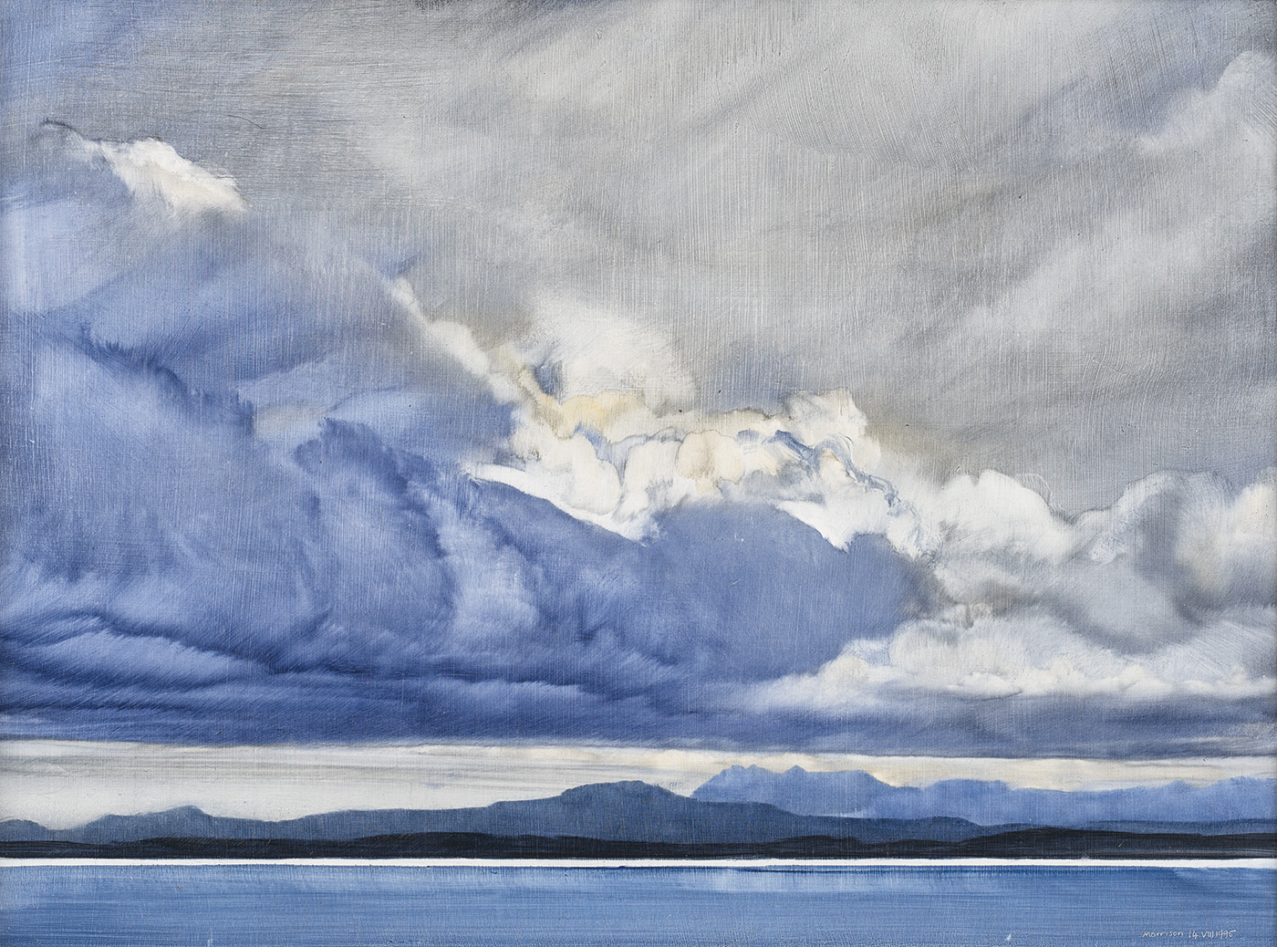 Cloud over Torridon positions the viewer between earth and sky, with the Torridon hills anchored beneath an immense, rolling cloud mass. Painted in 1995, this small-scale oil on board pulses with scale and grandeur. The palette is cool, layered, and restrained, evokes not just the look but the feeling of the Highlands: the shifting air, the weight of moisture, the hush before a coming squall. The clouds are masterfully rendered, full of kinetic energy, as if moving toward us and overhead. Morrison returned often to this landscape, drawn by its changing light and towering geology, a place where land, sea, and sky seem in constant negotiation.