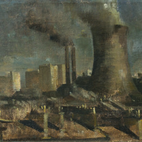 Earnest’ ‘Earnie’ Hood was born in Edinburgh but made his career in Glasgow, after training at Glasgow School of Art. He was a keen exhibitor at the Glasgow Arts Club and is best known for his atmospheric cityscape and industrial scenes. This striking painting shows Glasgow’s Pinkston Power Station, seen from across the roofs and chimney pots from the south. When it was built in 1900 it was the largest cooling tower in Europe, looming over the city around. During the war it was given a camouflage paint to make it more difficult for the Luftwaffe to spot, traces of which were still visible when the station was demolished in 1978.