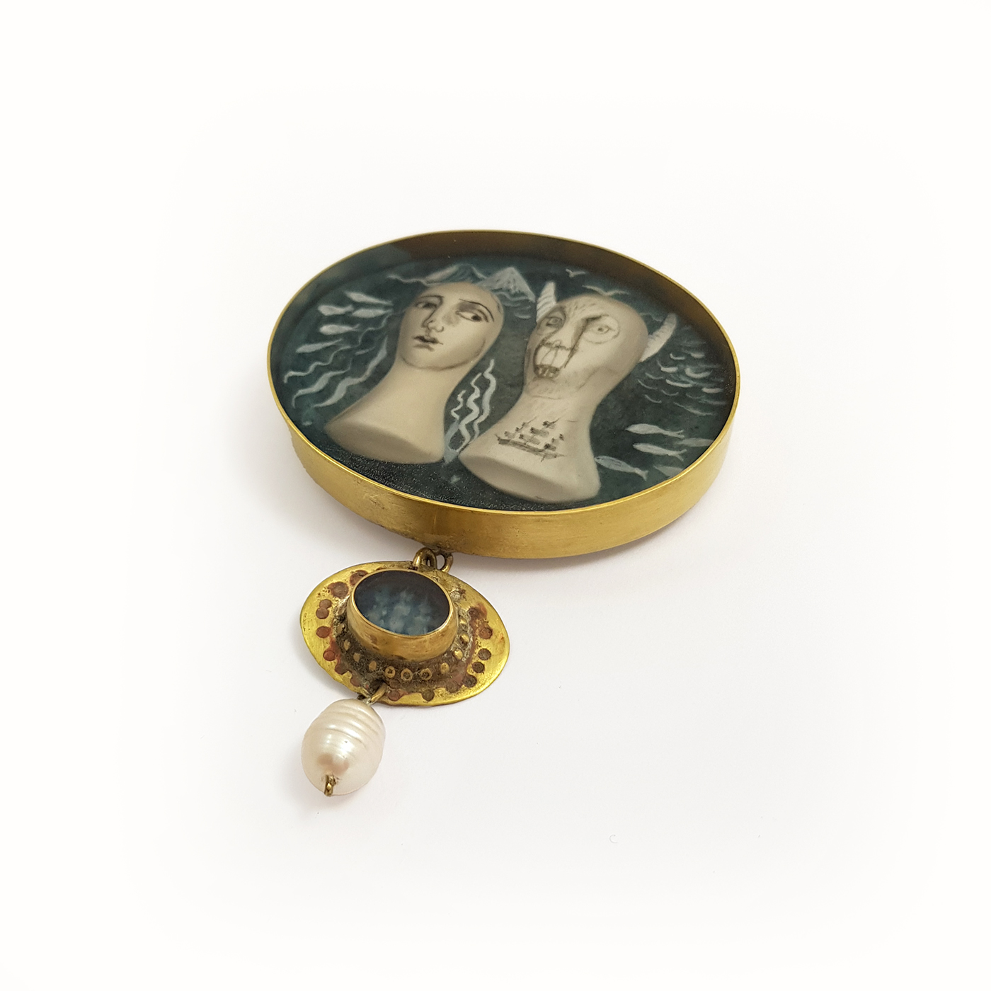 Rachel Larkins is a designer maker whose practice has focussed on creating jewellery with a strong sense of narrative and a nod to the tradition of miniatures. Larkins works primarily in resin, brass and wood, often encapsulating imaginary scenes and figures which are hand modelled and painted. Based in the village of Sopley, Larkins’s influences range from the surrounding rural landscape and seasonal folklore to magical realism in literature and painting.
