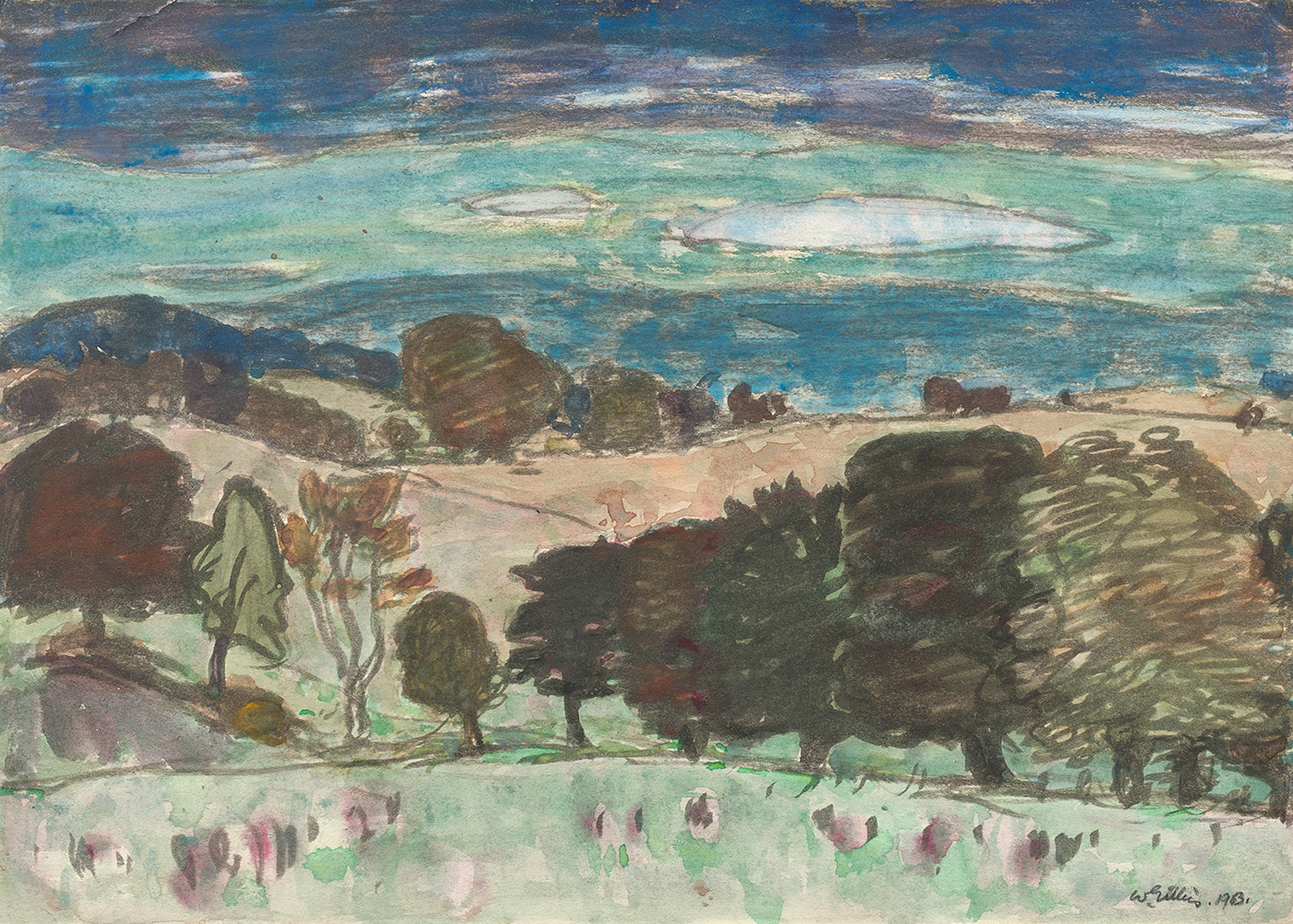 Gillies was never more at ease than when painting en plein air in this part of the world. He would set out on his motorbike or in his car, often with artist friends in tow, to roam the countryside he loved. Here, far from the constraints of the studio, he found pure pleasure in painting and drawing, and the joy of being in the landscape.