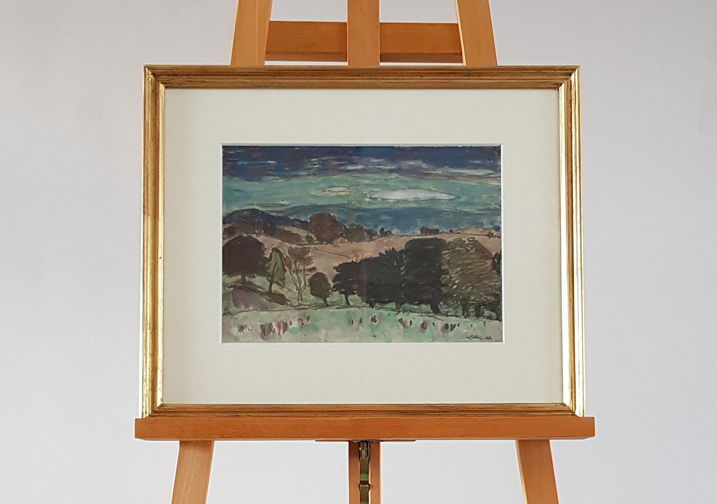 Here, Gillies captures a Borders landscape distilled to its essential forms, rendered with quiet confidence. Clear pencil lines structure the composition where even the clouds are outlined, introducing a graphic clarity that holds the translucent washes in place. The sky forms a gentle pattern that echoes the undulating hills, while a rhythmic band of trees marks the threshold of the scene. The colour palette hints at the arrival of autumn: muted ochres, softened greens, and rust tones.