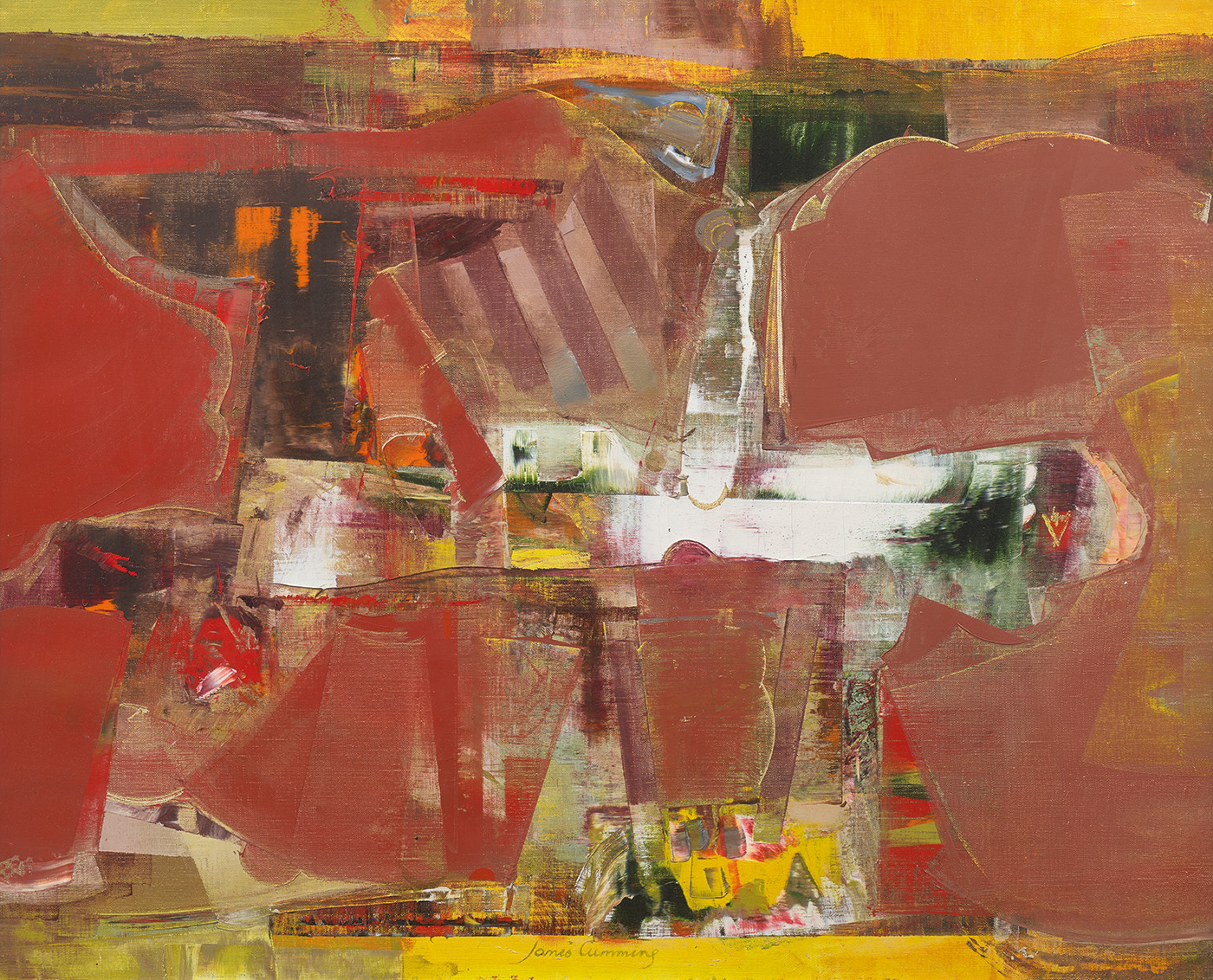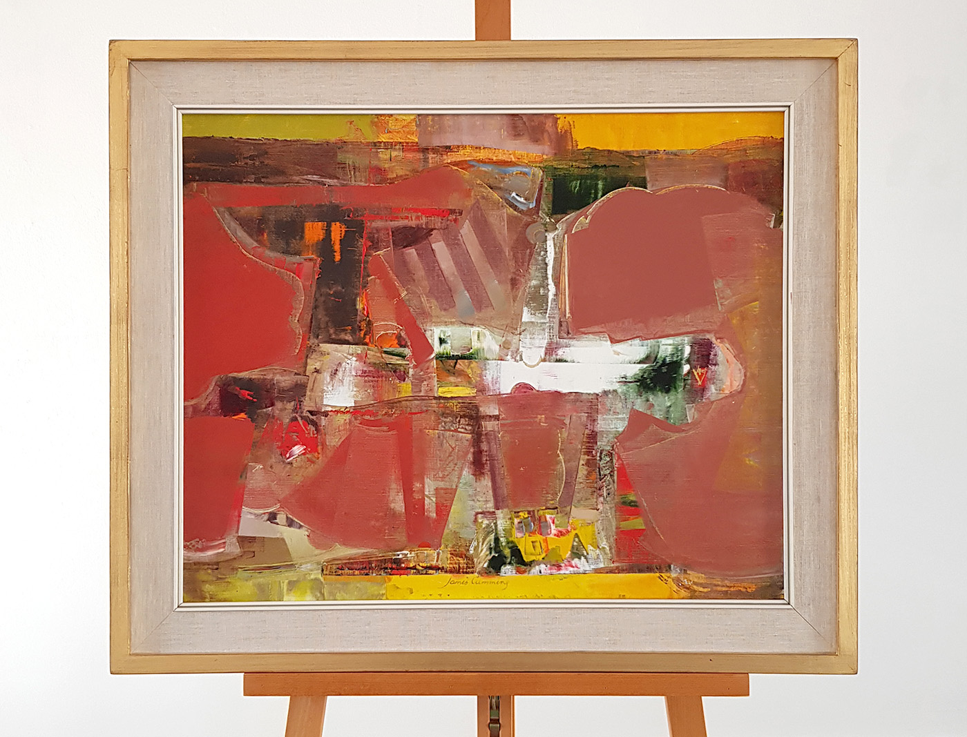 In this painting, James Cumming transforms a fleeting moment into an abstract and poetic visual statement. Far from a literal depiction, the painting captures the sensation of birds in motion, rendered in a kaleidoscope of mauves, yellows, golds, and pinks, where form dissolves into colour and structure gives way to rhythm. A composition of exceptional clarity and invention, the work is both intellectually constructed and instinctively felt, qualities that define Cumming’s distinctive approach to modern painting.