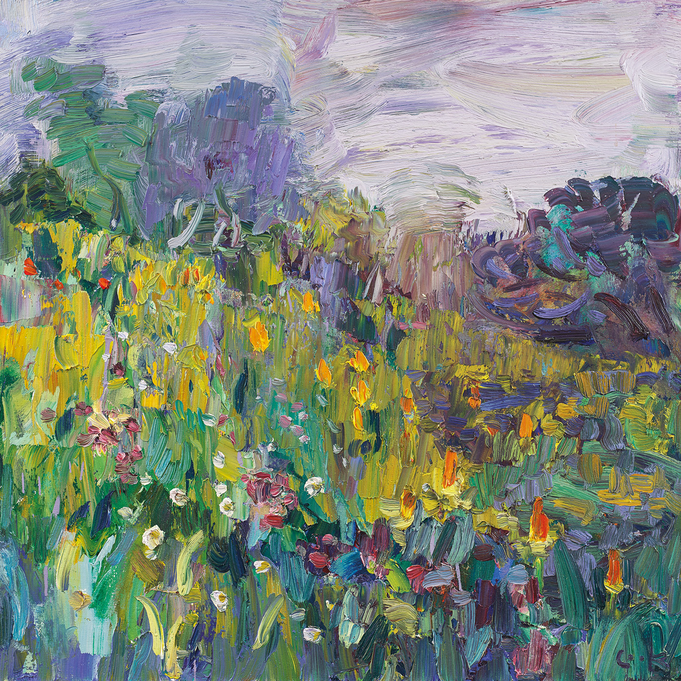 In the 1990s he was already visiting Seagreens (his current home) and staying at a cottage at Benholm, two miles to the North also frequented by Alberto Morocco and Ian Eadie. Cook travelled regularly in these years to Turkey, the Balearics and significantly, at the invitation of the Everard Reed Gallery, to Southern Africa for three months in 1997. He was able to secure the tenancy at Seagreens shortly after his return and eventually bought it in 2004. This sense of belonging is now deeply embedded; he can see the seasons change and paint the whole calendar; the daffodils of Spring, wild flowers of Summer, the Autumn skies and bleak drama of Winter are all on show: immediate, raw and compelling.
