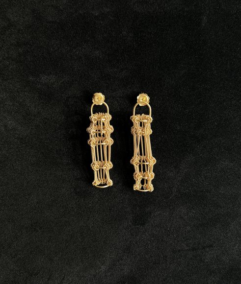 Ruth has been designing and making playful, sculptural jewellery since 2015. Her eponymous jewellery collection is made by hand using recycled silver and gold and is inspired by both the subtle details within fabrics as well as the intricate constructions within textile machinery. Ruth finely twists wire using an old-fashioned hand drill which is then cut and wrapped around frames to create tactile, refined forms – like dangling architecture.