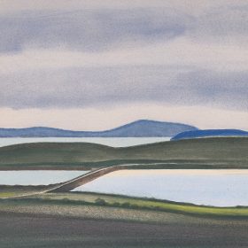 From the late 1960s, Bet Low’s connection with Orkney became central to her life and work. In 1967, she and her husband, the journalist Tom Macdonald, bought a small cottage at Lyness on the island of Hoy. Although she continued to live and work in Glasgow, the landscape of Hoy, with its vast horizons and ever-shifting light, came to define much of her later painting.