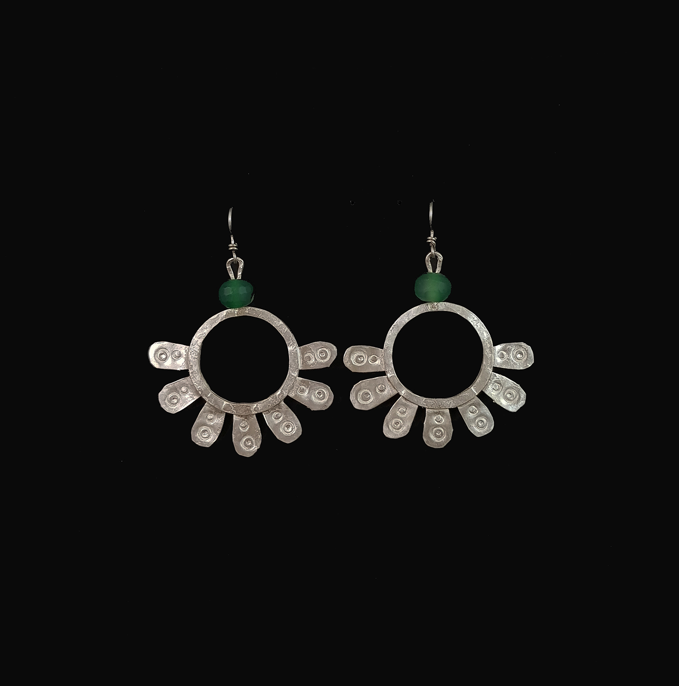 Using the simplest of tools and methods, he works mainly with sheet silver, which is cut, bent, beaten and formed. This metal work compliments his use of natural pebbles and semi-precious stones, which are ground, shaped and drilled into beads.