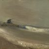 Grey Beach and Sky was painted at the water’s edge of Catterline Bay. Eardley frames the left side of the composition with the high cliff bank above the boat shed, while to the right, we see the distinctive kale tap, a large rock formation anchoring many of her Catterline paintings. In front of the boat shed, two boats are depicted: the blue Linfall and the green Mascot, owned by local fishermen who, like Eardley, lived in cottages overlooking the bay. This tonal painting captures the drama of a winter storm, with the sky and sea mirroring each other in foreboding grey. The surf crashes against the beach with the pier totally engulfed by the energy of the North Sea swell.