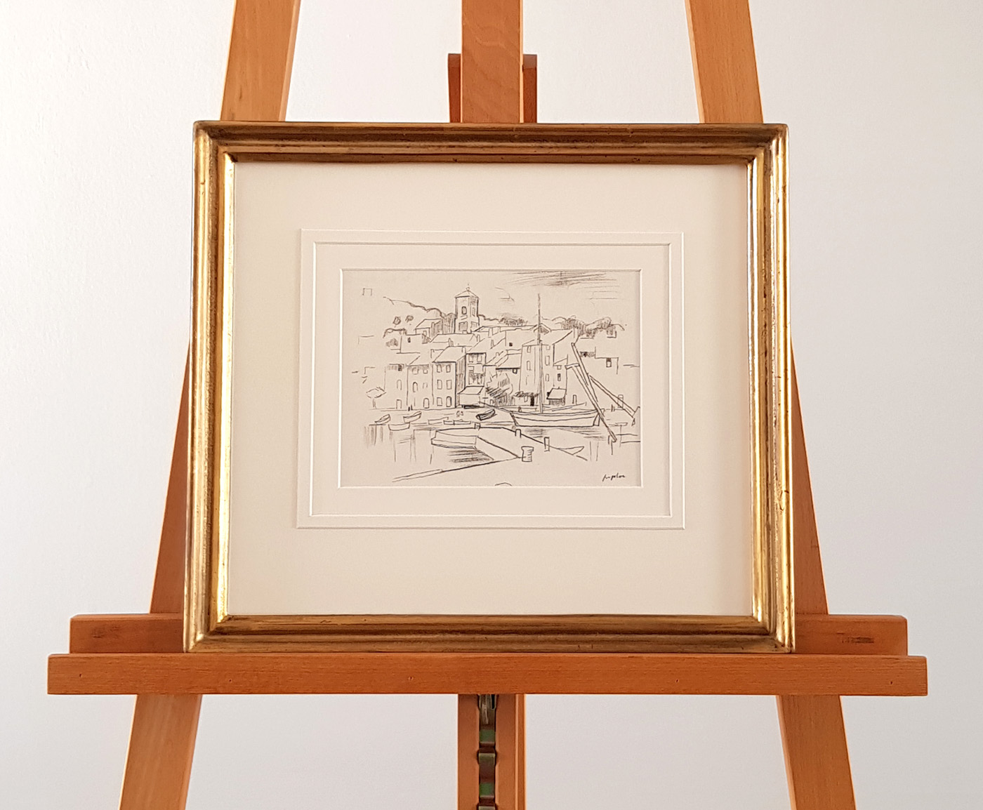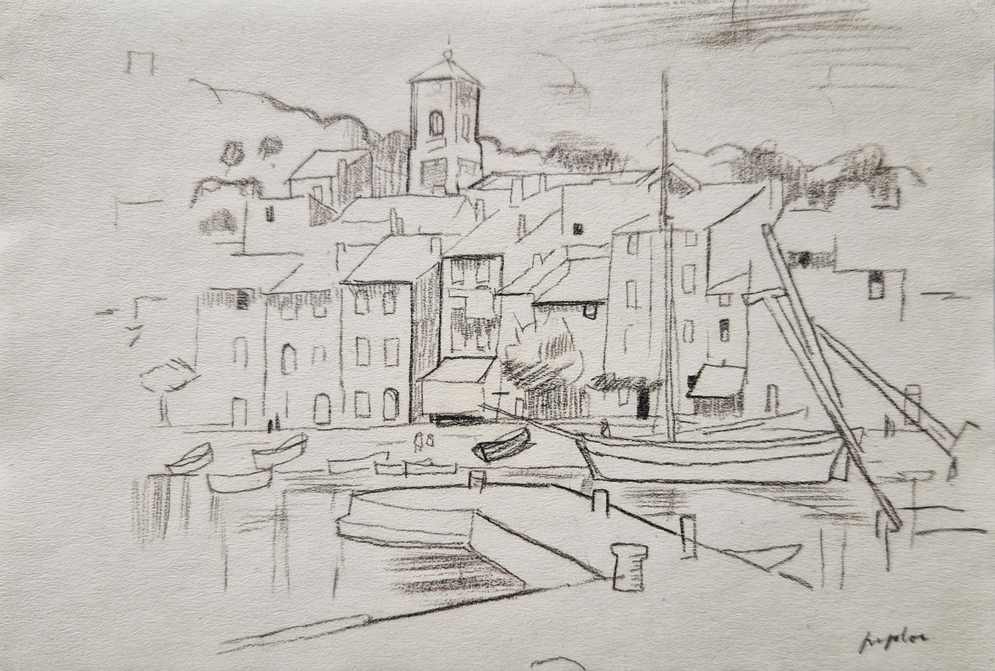 Executed in Conté, Harbour, Cassis is not a casual sketch but a fully resolved visual study. He captures the distinctive architecture of the harbour town, its boats, buildings and quayside clearly articulated. Many other drawings were used for paintings also, full of accurate information, but also beautifully considered for composition. A decade later when Peploe next returned, he found new subjects and used larger format canvasses. His friend Bunty Cadell accompanied the Peploe family this time and made a painting from the near identical viewing point in Harbour, Cassis. This example, in perfect condition, represents a key moment in the artist’s development as well as exemplifying the complex but direct relationship between drawing and painting in his practice.