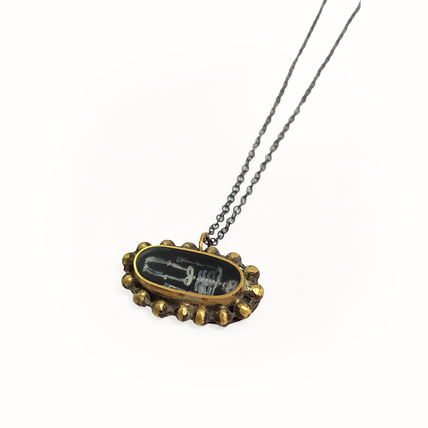 Rachel Larkins is a designer maker whose practice has focussed on creating jewellery with a strong sense of narrative and a nod to the tradition of miniatures. Larkins works primarily in resin, brass and wood, often encapsulating imaginary scenes and figures which are hand modelled and painted. Based in the village of Sopley, Larkins’s influences range from the surrounding rural landscape and seasonal folklore to magical realism in literature and painting.