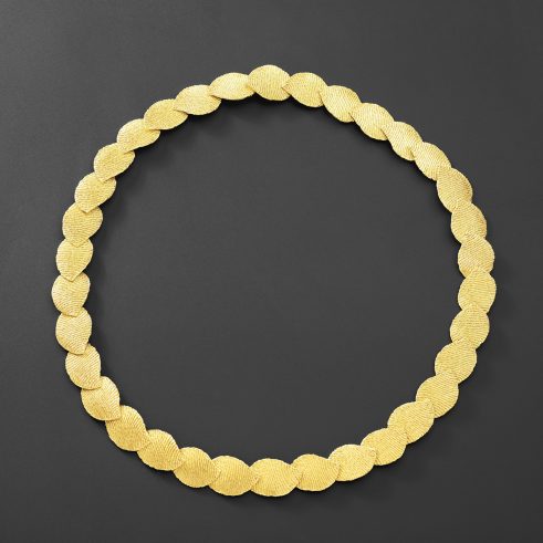 Martin comments, “I like working with gold. I love the colour and sensuality but above all the timelessness…the thought of continuing a tradition of using this beautiful material which has been used for adornment for centuries. I hand braid fine gold wire which gives a particular and unique lustre that is soft and shimmers as it moves.”