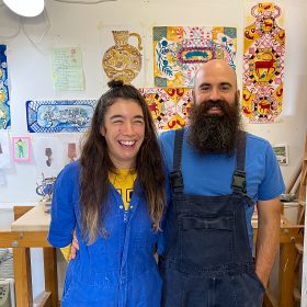 Vicky Lindo and Bill Brookes are inspired by traditional English slipware pottery and images that Lindo describes as, anything from a funny story heard on the radio, heroic animals, a pattern on an antique rug or a beautiful old tree in the local park.