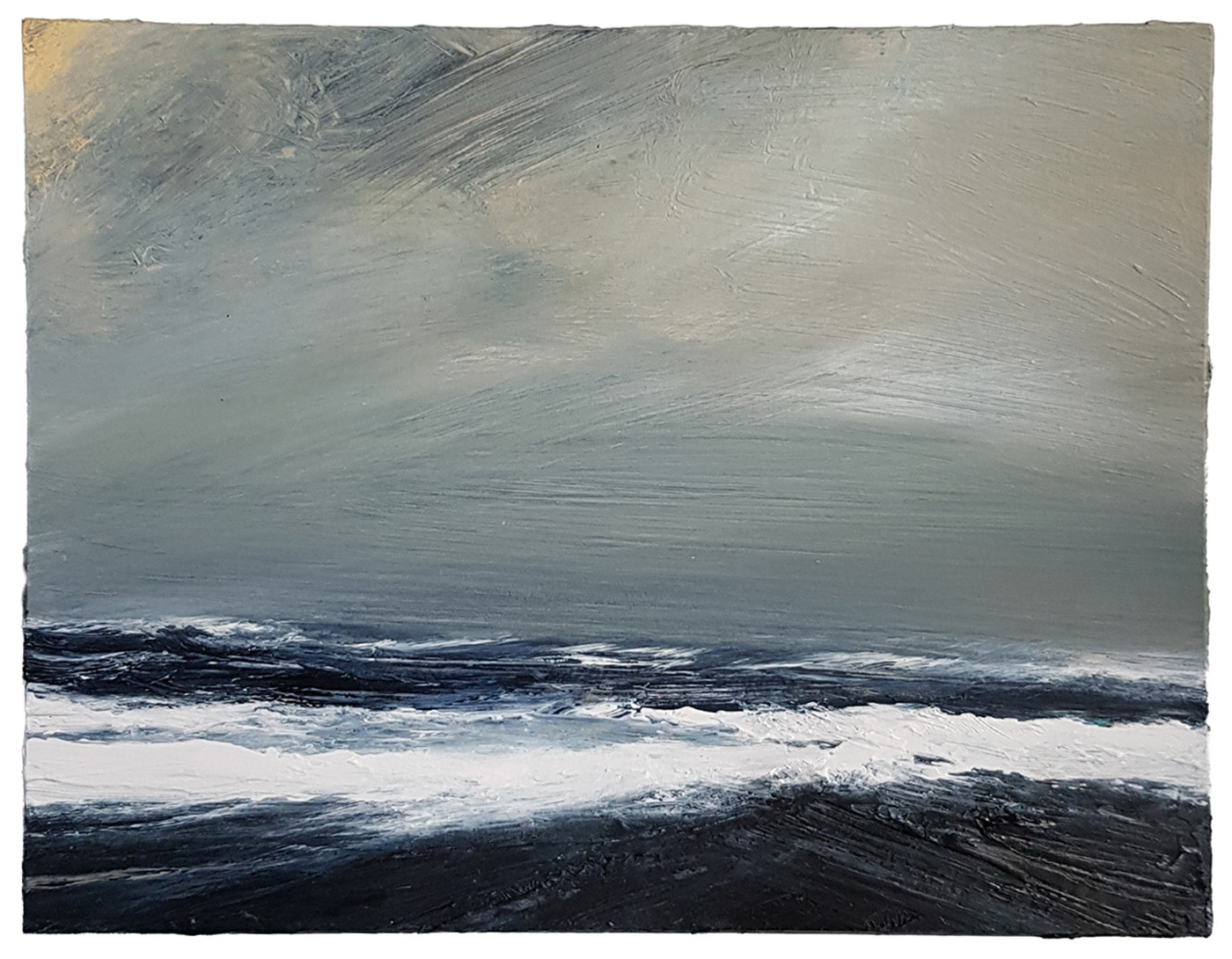 Having lived by the sea since visiting Shetland to teach a painting workshop 24 years ago, my work continues to be inspired by this archipelago in the North Sea. Shetland is a rugged environment with an intense visual drama of constant changing elements. As I love walking and walk whenever I can; I watch the weather, and read the mood of the sea which filters into my studio practice. Capturing the intense atmosphere of this wild place is more important to me than trying to include the details of the coastal landscape.