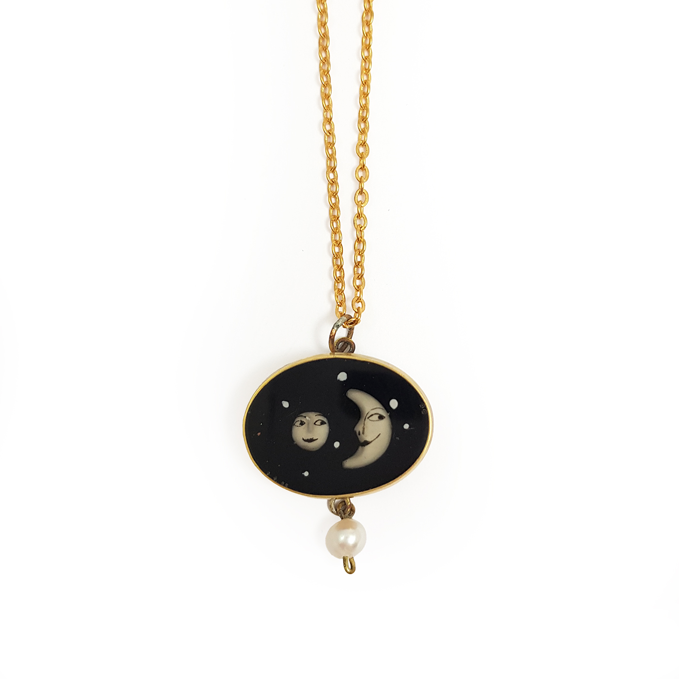 brass, resin, hand painted inserts, freshwater pearl drop, gold plated chain