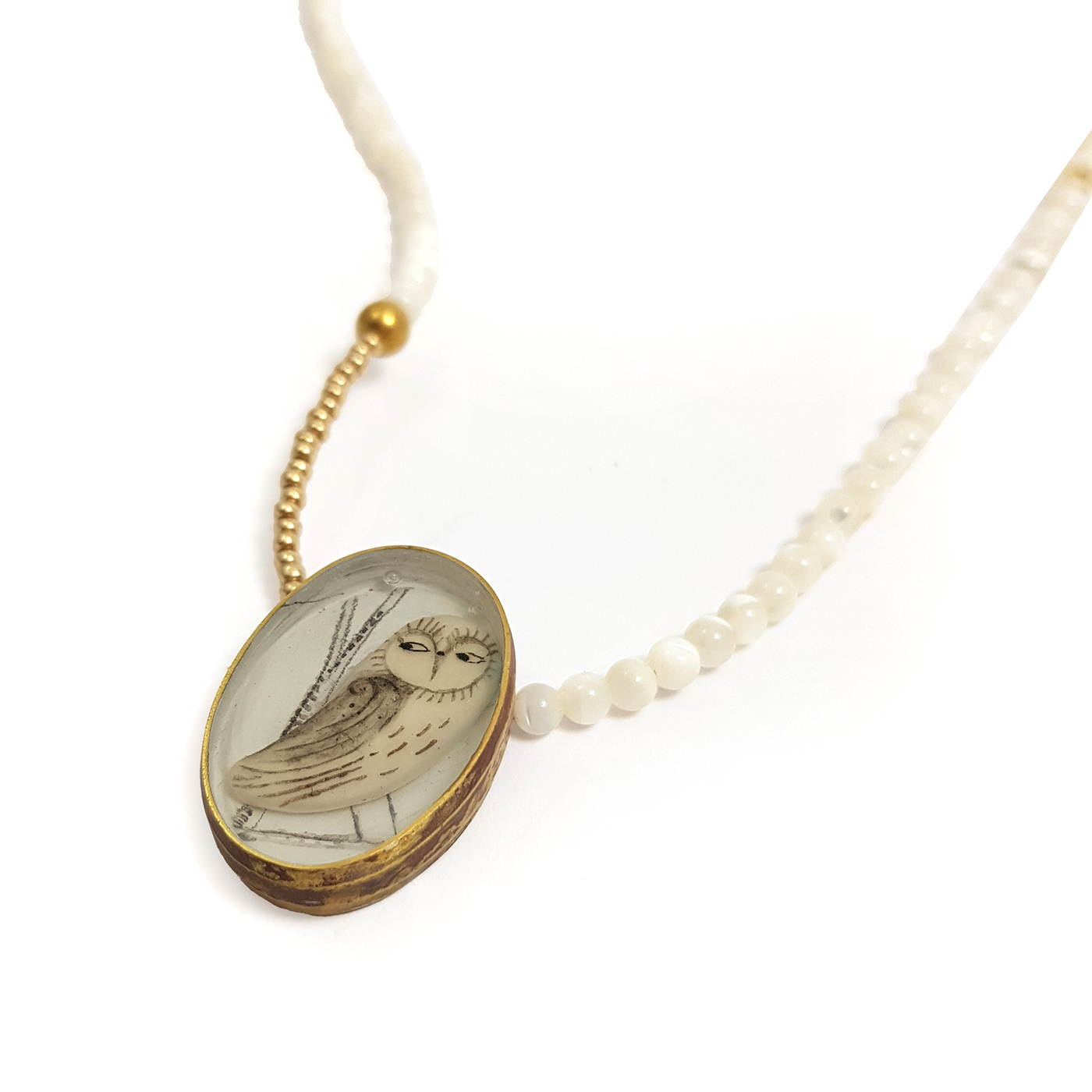 Rachel Larkins is a designer maker whose practice has focussed on creating jewellery with a strong sense of narrative and a nod to the tradition of miniatures. Larkins works primarily in resin, brass and wood, often encapsulating imaginary scenes and figures which are hand modelled and painted. Based in the village of Sopley, Larkins’s influences range from the surrounding rural landscape and seasonal folklore to magical realism in literature and painting.