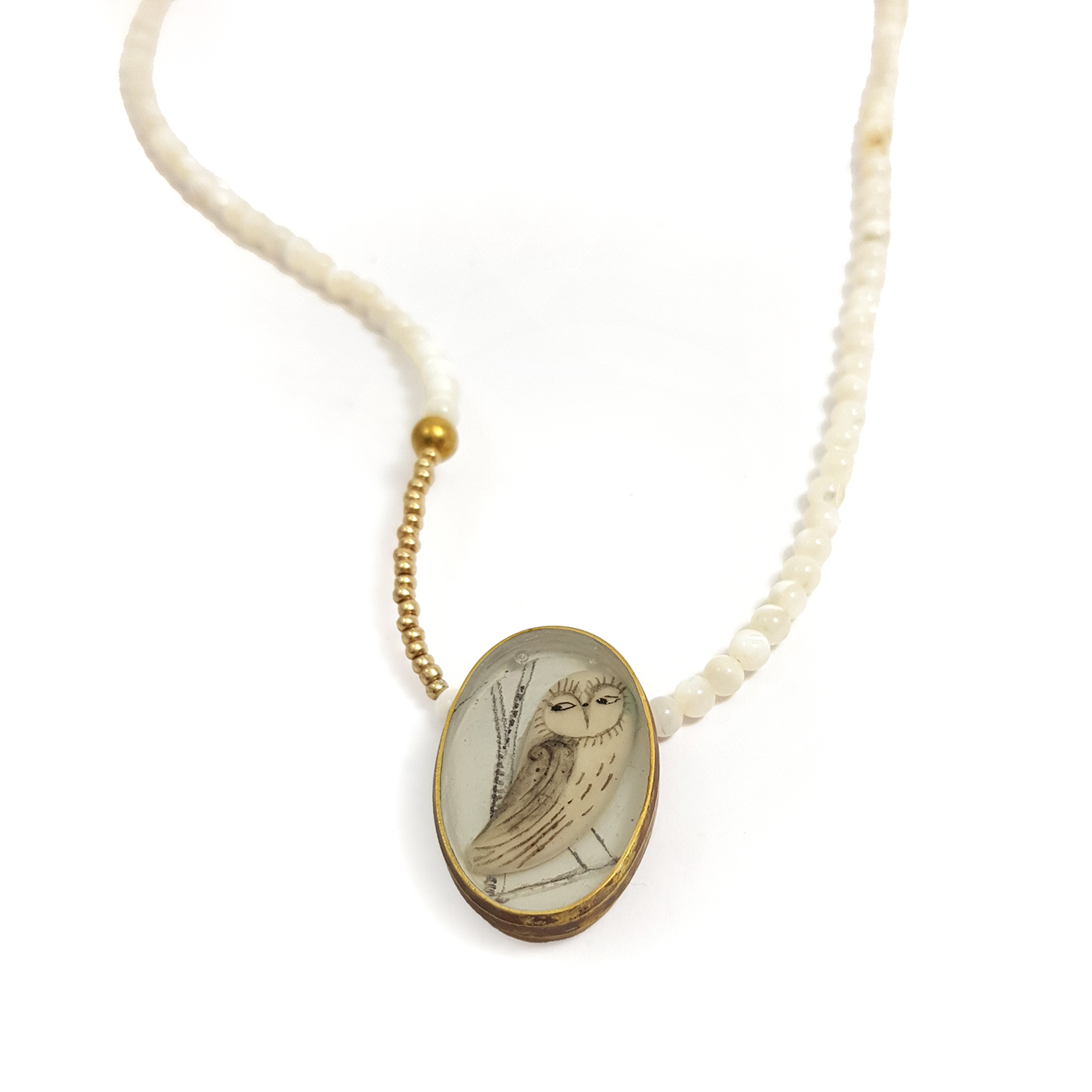 brass, resin, hand painted insert, gold miyuki and mother of pearl beads