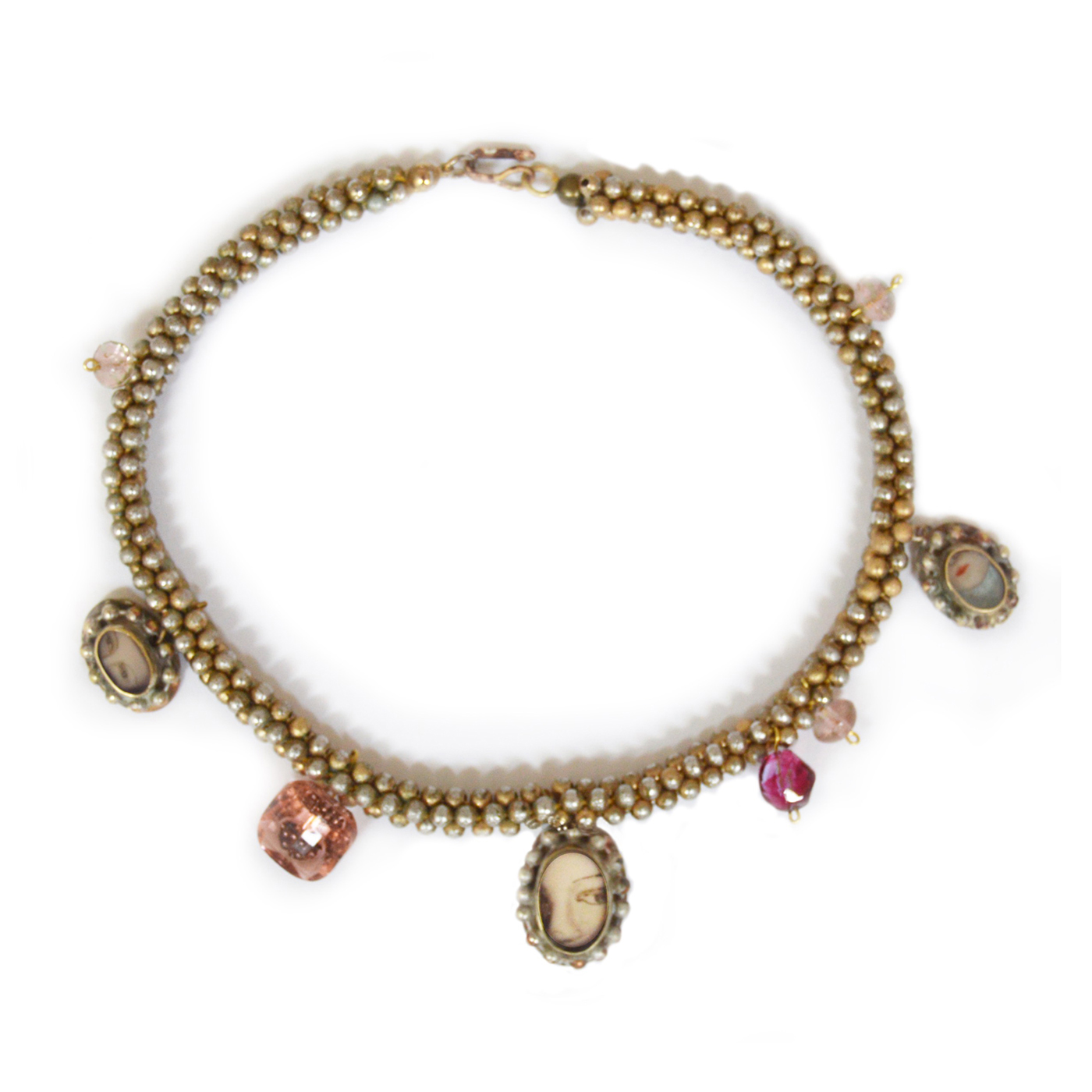 brass, resin, hand painted insert, antique glass beads