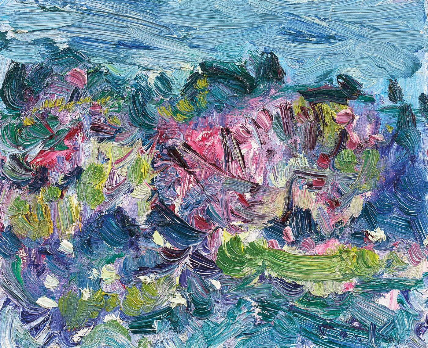 In the 1990s he was already visiting Seagreens (his current home) and staying at a cottage at Benholm, two miles to the North also frequented by Alberto Morocco and Ian Eadie. Cook travelled regularly in these years to Turkey, the Balearics and significantly, at the invitation of the Everard Reed Gallery, to Southern Africa for three months in 1997. He was able to secure the tenancy at Seagreens shortly after his return and eventually bought it in 2004. This sense of belonging is now deeply embedded; he can see the seasons change and paint the whole calendar; the daffodils of Spring, wild flowers of Summer, the Autumn skies and bleak drama of Winter are all on show: immediate, raw and compelling.