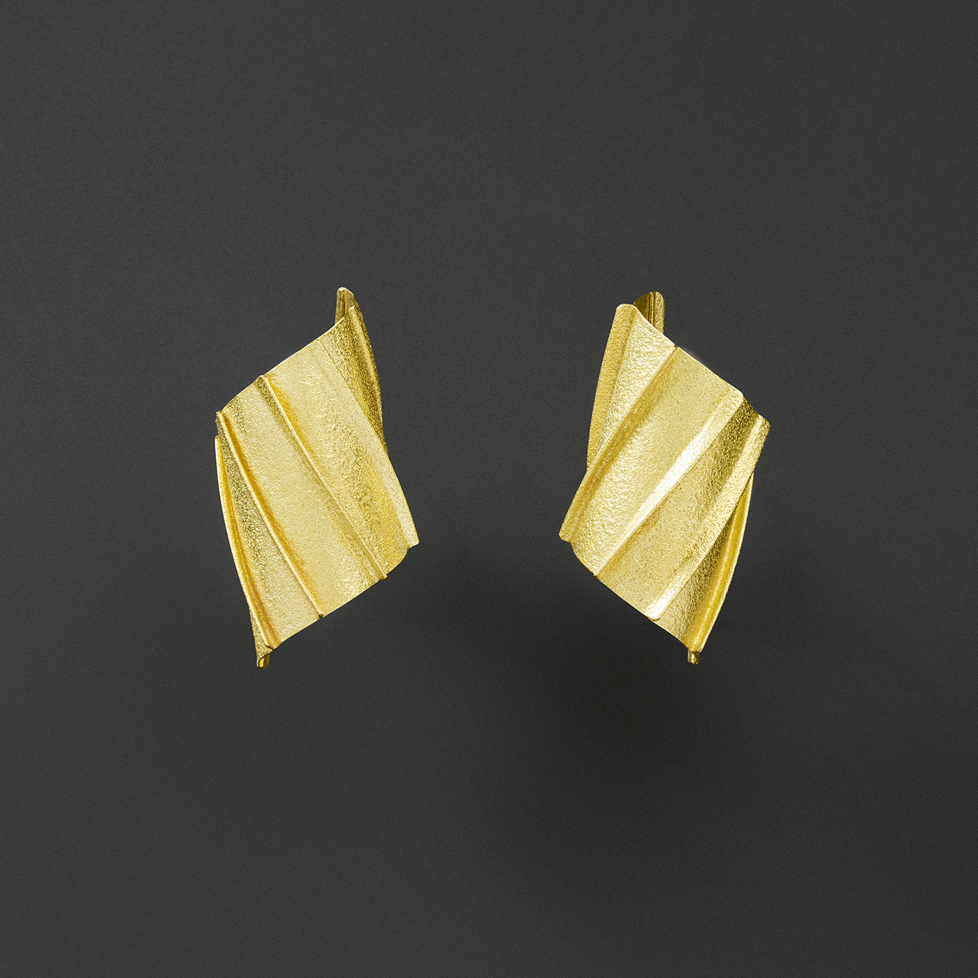 Jacqueline Mina’s technical brilliance, allied with her strong artistic curiosity has resulted in a range of sensuous, understated work, which has a rare aesthetic presence in the field of contemporary gold jewellery. Her superb technical accomplishment in manipulating precious metals is combined with a fine, painterly eye. Sources of inspiration include the Venetian Palazzo Fortuny with its textile drapes; featuring devoré velvet with their etched patterns.