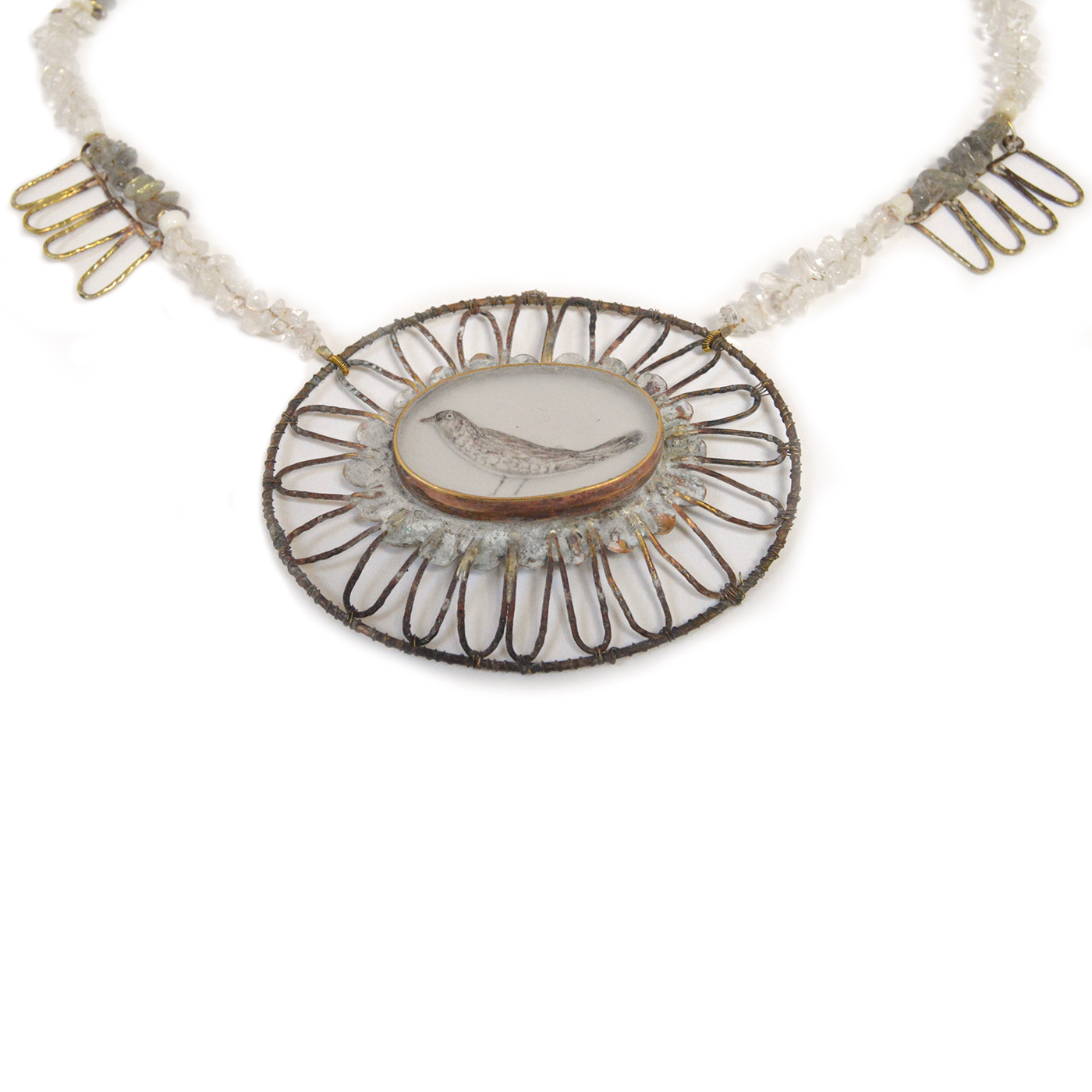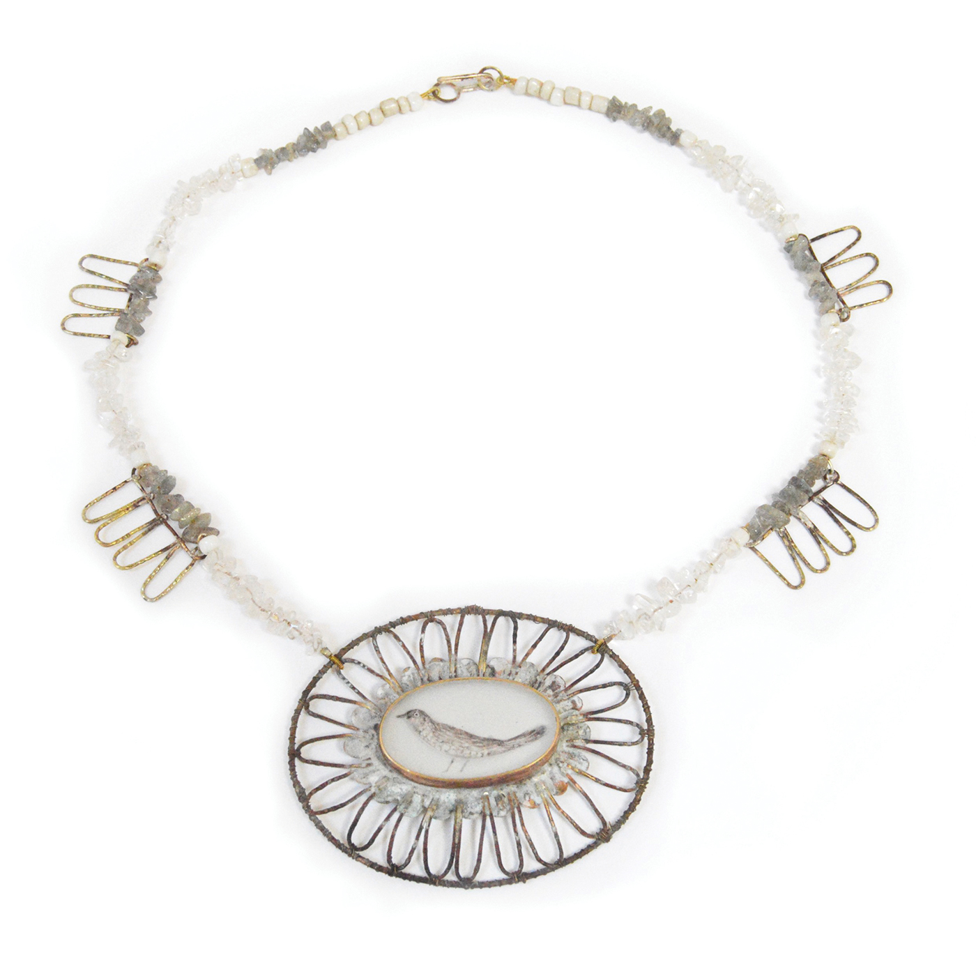 ‘I have always been drawn to objects behind glass, perhaps in recognition that someone from the past has preserved those things considered precious and ephemeral; mourning jewellery holding hair; bell jars holding birds, insects or dolls; dioramas and ships in bottles. The wearable pieces I make are influenced by the intimacy and hidden stories of small scale miniatures as well as by folklore and fairy tales.’ Rachel Larkins