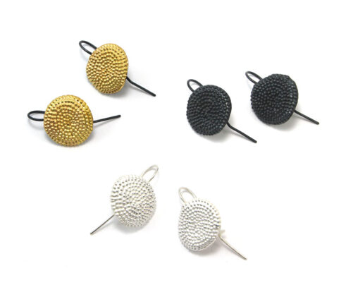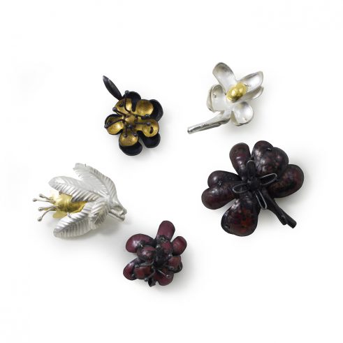 Julie Blyfield makes jewellery, small-scale vessels and sculptural objects in her studio nestling in the garden of her home in Adelaide, South Australia. Inspired by the botanical landscape in Australia, Julie’s favoured medium of expression is silver. This she uses in its softer pure form as well as in its stronger alloyed form – sterling silver. Her jewellery and vessels are characterised by seductive textured surfaces created using traditional silversmithing techniques such as hammering, chasing, punching and piercing. Rhythmical repetition is a key element of both her design process and her aesthetic, and the use of colour is also apparent. Following the traumatising Australian bushfires of 2007, Blyfield echoed the scorched colour and searing heat with enamel paint and startling glints of gold and silver set against charred blacks and ash greys.