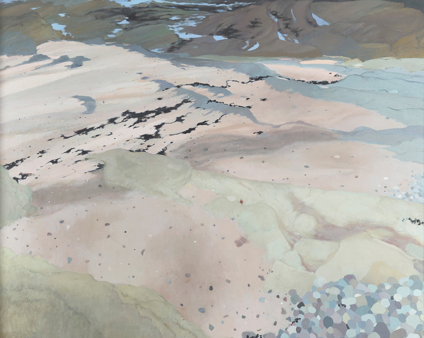 Born in Kirkcaldy in 1930, Frances Walker studied at Edinburgh College of Art and then took up a post as visiting teacher of art for the Hebrides. This experience engendered in her a life-long love of wild and desolate places and since then she has chosen to depict the most remote landscapes, her compositions usually based on coastal reaches, craggy rocks and deserted beaches. Moving to Aberdeen, where she has now lived and worked for 60 years, Walker took up a post at Gray’s School of Art. After retirement in 1985, she has since divided her time between Aberdeen and the Western Isles, especially Tiree, where she owns a thatched cottage, but has also travelled further afield – her latest inspiration being the even wilder and more desolate landscape of the Antarctic and South Georgia. A suite of Antarctic paintings were recently bequeathed and exhibited as part of a major exhibition, Among the Polar Ice at The McManus in Dundee (September 2019 – March 2020). Walker was a founding member of Peacock Print Studio in Aberdeen, and printmaking continues to form an important part of her artistic practice. She was recognised with a CBE in the Queen’s birthday honours in 2021.